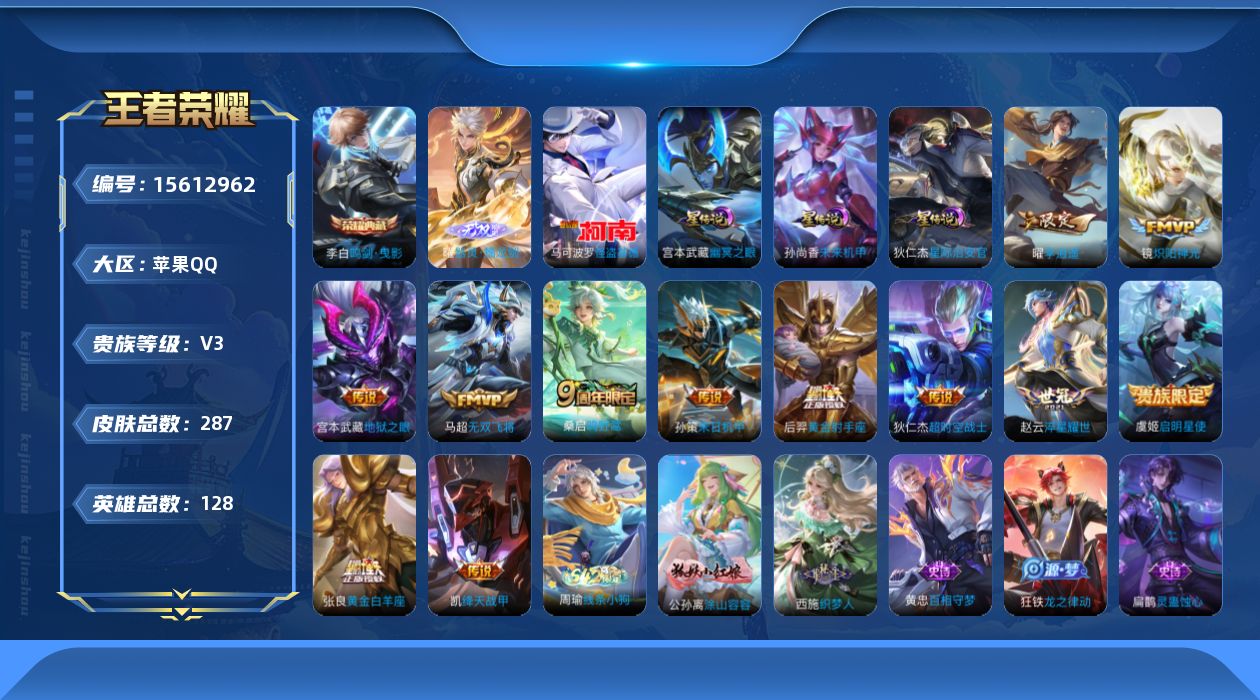 [15612962]可二次【店主推荐捡漏号!可直接换绑】苹果Q-V3-至尊星耀I段位-127英雄-281皮肤-1典藏皮肤-1无双-1珍品传说-11传说-78史诗-3星元 【英雄全皮】:鬼谷子全皮,蒙恬全皮,影全皮 【荣耀典藏】:李白鸣剑曳影 【无双皮肤】:曜器灵螭龙剑 【珍品传说】:马可波罗怪盗基德 【传说皮肤】:桑启鸣野蒿,马超无双飞将,孙策末日机甲,赵云淬星耀世,曜李逍遥 ,铠绛天战甲,镜炽阳神光,张良黄金白羊座,后羿黄金射手座,宫本武藏地狱之眼,狄仁杰超时空战士 【限定皮肤】:白起狰,蒙犽顽岩魄,蔡文姬夏日便利店,虞姬夏日便利店,姜子牙天穹之誓,狄仁杰阴阳师,虞姬凯尔特女王,赵云皇家上将,墨子神迹守卫,嬴政优雅恋人,鲁班七号狮舞东方,庄周高山流水,高渐离玩趣恶龙,芈月重明,芈月幻夜卜梦,周瑜赤莲之焰,元歌云间偶戏,元歌无心,夏侯惇朔风刀,典韦穷奇,狄仁杰魔术师,狄仁杰万华元夜,达摩沙漠行僧,项羽海滩派对,老夫子醍醐杖,老夫子航海奇遇记,关羽冰锋战神,程咬金演武夺筹,兰陵王驯魔猎人,兰陵王金庭之子,亚瑟潮玩骑士王,孙悟空至尊宝,牛魔御旌,后羿圣弓游侠,李元芳银河之约,李元芳云中旅人,钟馗神迹守卫,钟馗驱傩正仪,杨玉环遇见飞天,干将莫邪真爱魔法,雅典娜黎明之约,太乙真人饕餮,太乙真人华丽摇滚,鬼谷子原初探秘者,鬼谷子五谷丰年,黄忠火炮绅士,苏烈千军破阵,百里玄策原初追逐者,弈星混沌棋,梦奇顽趣,沈梦溪星空之诺,沈梦溪大漠名商,明世隐疑决卦,裴擒虎李小龙,裴擒虎擒涛扼浪,狂铁御狮,米莱狄御霄,云中君纤云弄巧,盾山御銮,上官婉儿梁祝,曜李逍遥 ,鲁班大师探海日志,桑启海盐诗旅,司空震地狱燃心,张良古海寻踪,蒙恬荣光圣徽,鬼谷子天穹祈灯,姬小满妄想食味,沈梦溪龙舞盛年,刘邦剑破天穹,周瑜熔金海岸 【年限皮肤】:马超神威 【赛季限定】:白起狰,芈月重明,夏侯惇朔风刀,典韦穷奇,狄仁杰万华元夜,达摩沙漠行僧,老夫子醍醐杖,程咬金演武夺筹,兰陵王金庭之子,张良古海寻踪,牛魔御旌,李元芳云中旅人,虞姬凯尔特女王,钟馗驱傩正仪,雅典娜黎明之约,太乙真人饕餮,鬼谷子原初探秘者,苏烈千军破阵,百里玄策原初追逐者,弈星混沌棋,梦奇顽趣,沈梦溪大漠名商,明世隐疑决卦,裴擒虎擒涛扼浪,狂铁御狮,米莱狄御霄,盾山御銮,鲁班大师探海日志,桑启海盐诗旅,鬼谷子天穹祈灯,蒙恬荣光圣徽,刘邦剑破天穹,姜子牙天穹之誓