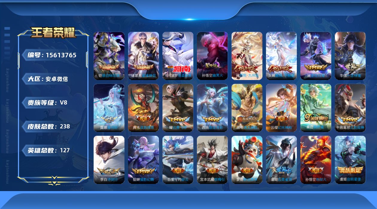 [15613765]安卓WX-V8-最强王者段位-127英雄-238皮肤-2典藏皮肤-1珍品传说-21传说-67史诗-1星传说(孙悟空:幽冥火)