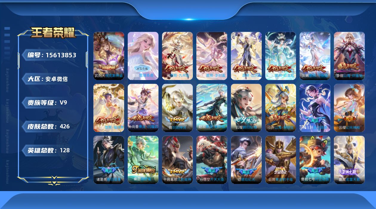 [15613853]安卓WX-V9-最强王者段位-满蛇年!-128英雄-426皮肤-1典藏皮肤-1典藏英雄-1无双-30传说-147史诗