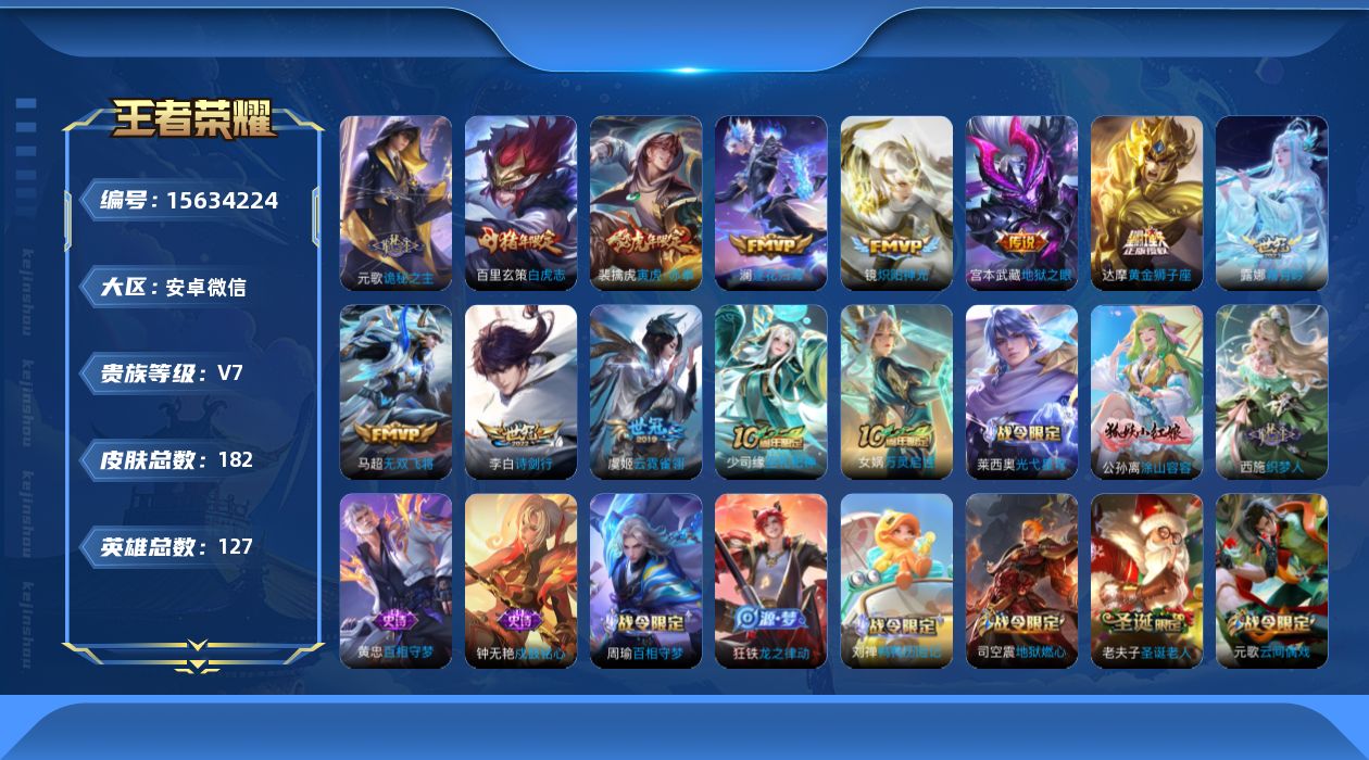 [15634224]安卓WX-V7-最强王者段位-127英雄-182皮肤-13传说-57史诗-元歌小国,对抗路58段 【英雄全皮】:元歌全皮,孙权全皮,影全皮 【传说皮肤】:杨戬纵目迁山,后羿神树通天,元歌诡秘之主,澜逐花归海,露娜霜月吟,李白诗剑行,马超无双飞将,裴擒虎寅虎赤拳,镜炽阳神光,虞姬云霓雀翎,达摩黄金狮子座,百里玄策白虎志,宫本武藏地狱之眼 【限定皮肤】:大乔绒语心约,虞姬夏日便利店,姜子牙天穹之誓,狄仁杰阴阳师,赵云皇家上将,吕布猎兽之王,元歌云间偶戏,元歌无心,狄仁杰魔术师,达摩沙漠行僧,项羽海滩派对,老夫子圣诞老人,兰陵王金庭之子,花木兰瑞麟志,李元芳云中旅人,雅典娜黎明之约,鬼谷子五谷丰年,百里玄策白虎志,梦奇顽趣,沈梦溪大漠名商,裴擒虎寅虎赤拳,云中君纤云弄巧,嫦娥拒霜思,鲁班大师探海日志,桑启海盐诗旅,艾琳流音漫舞,司空震地狱燃心,张良古海寻踪,蒙犽百解令,蒙恬荣光圣徽,高渐离燃音魔法,妲己灵卜魔法,鬼谷子天穹祈灯,沈梦溪龙舞盛年,鲁班七号蔬乡物语,李元芳蔬乡物语,刘邦剑破天穹,关羽决胜骁骑,镜青焰无极,项羽苍威无极,刘备异域游侠,周瑜熔金海岸 【年限皮肤】:百里玄策白虎志,花木兰瑞麟志,裴擒虎寅虎赤拳 【赛季限定】:达摩沙漠行僧,兰陵王金庭之子,张良古海寻踪,李元芳云中旅人,雅典娜黎明之约,梦奇顽趣,沈梦溪大漠名商,鲁班大师探海日志,桑启海盐诗旅,鬼谷子天穹祈灯,蒙恬荣光圣徽,刘邦剑破天穹,姜子牙天穹之誓 【战令限定】:虞姬夏日便利店,吕布猎兽之王,元歌云间偶戏,艾琳流音漫舞,司空震地狱燃心,高渐离燃音魔法,妲己灵卜魔法,鲁班七号蔬乡物语,李元芳蔬乡物语,镜青焰无极,项羽苍威无极 【史诗皮肤】:露娜紫霞仙子,赵云皇家上将,赵云未来纪元,老夫子圣诞老人,甄姬冰雪圆舞曲,狄仁杰魔术师,宫本武藏鬼剑武藏,孙尚香水果甜心,嬴政摇滚巨星,妲己魅力维加斯,曹操幽灵船长,吕布末日机甲,张飞乱世虎臣,花木兰水晶猎龙者,刘邦德古拉伯爵,小乔缤纷独角兽,兰陵王暗隐猎兽者,诸葛亮黄金分割率,亚瑟心灵战警,雅典娜冰冠公主,百里守约特工魅影,蔡文姬舞动绿茵,李元芳逐浪之夏,白起星夜王子,花木兰瑞麟志,狄仁杰鹰眼统帅,云中君纤云弄巧,元歌云间偶戏,杨戬天秀启明,钟馗乐园奇幻夜,嫦娥拒霜思,雅典娜黎明之约,澜赏金猎手,鬼谷子五谷丰年,元歌无心,梦奇顽趣,司空震地狱燃心,蒙犽百解令,妲己