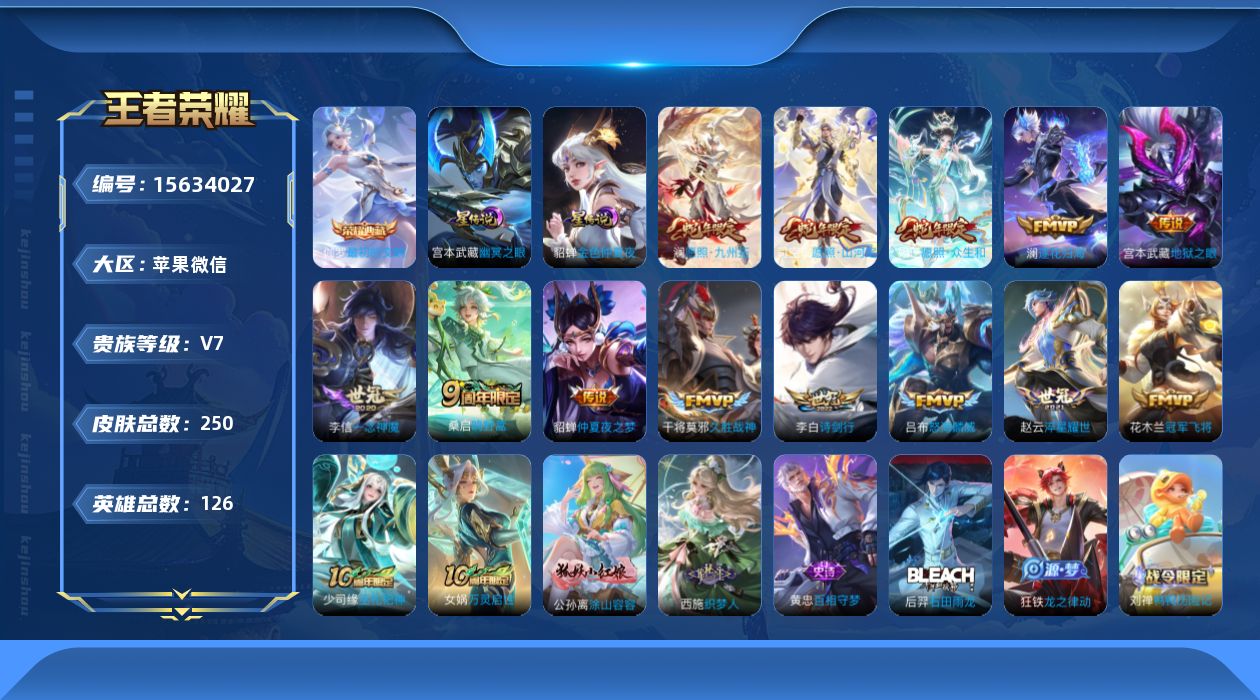 [15634027]苹果WX-V7-最强王者段位-126英雄-250皮肤-1典藏皮肤-14传说-72史诗