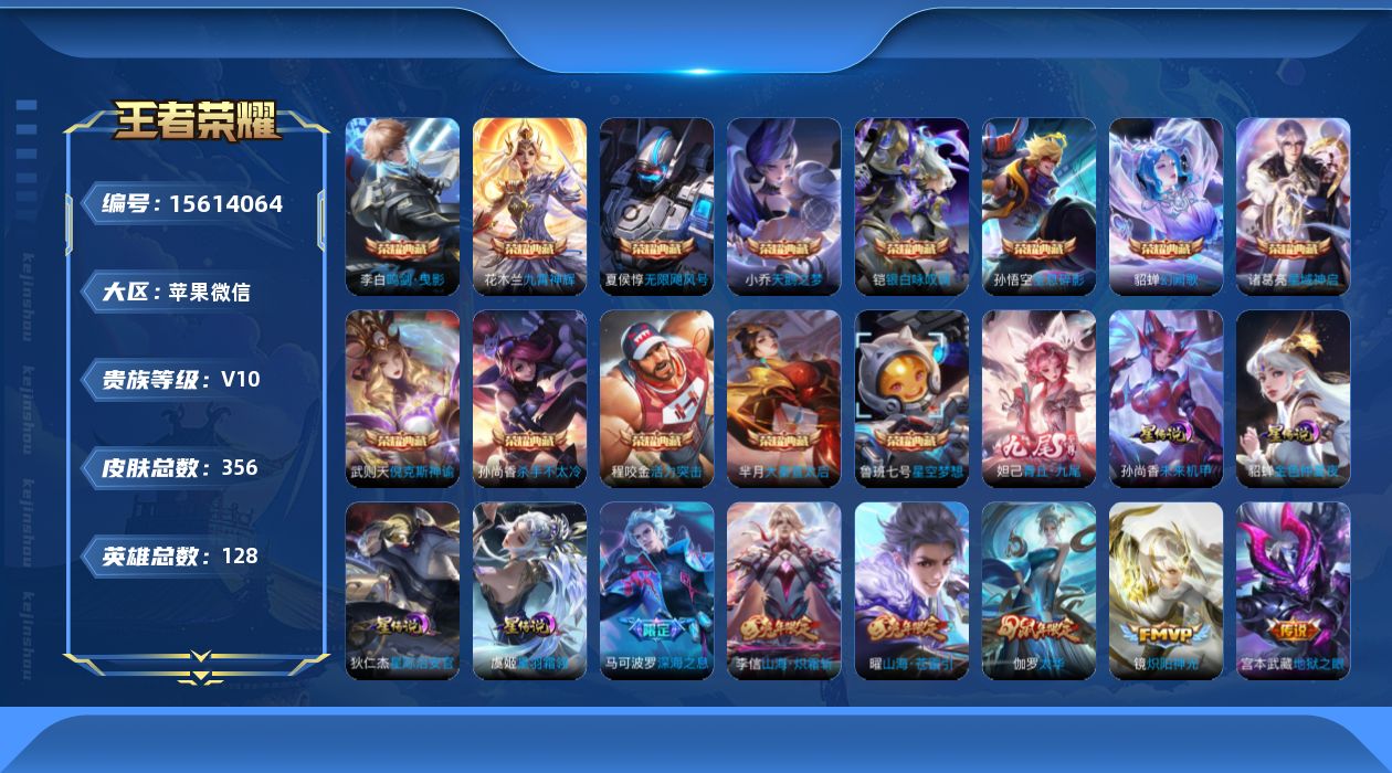 [15614064]社交限制介意勿拍!苹果WX-V10-至尊星耀V段位-128英雄-356皮肤-13典藏皮肤-1典藏英雄-1无双-42传说-108史诗-4星传说(未来机甲,星际治安官,金色仲夏夜,黛羽霜翎) 【英雄全皮】:孙权全皮,李信全皮,夏洛特全皮,影全皮 【荣耀典藏】:武则天英雄,孙悟空全息碎影,武则天倪克斯神谕,夏侯惇无限飓风号,小乔天鹅之梦,孙尚香杀手不太冷,鲁班七号星空梦想,芈月大秦宣太后,程咬金活力突击,李白鸣剑曳影,诸葛亮星域神启,花木兰九霄神辉,铠银白咏叹调,貂蝉幻阙歌 【无双皮肤】:妲己青丘九尾 【传说皮肤】:后羿神树通天,桑启鸣野蒿,吕布曦玄引,艾琳觅芳踪,澜电玩雷克斯,张飞百相守梦,夏洛特浮生妄,虞姬无限倾心,项羽无限倾心,孙悟空齐天大圣,小乔山海琳琅生,曜山海苍雷引,李信山海炽霜斩,吕布怒海麟威,孙尚香音你闪耀,马可波罗深海之息,露娜启示之音,蔡文姬花朝如约,孙策末日机甲,孙尚香异界灵契,赵云淬星耀世,王昭君乞巧织情,西施游龙清影,周瑜音你心动,李元芳飞鸢探春,铠绛天战甲,镜炽阳神光,虞姬启明星使,李信一念神魔,刘备时之恋人,伽罗太华,貂蝉猫影幻舞,干将莫邪久胜战神,虞姬云霓雀翎,花木兰冠军飞将,梦奇胖达荣荣,后羿黄金射手座,貂蝉仲夏夜之梦,孙尚香末日机甲,宫本武藏地狱之眼,武则天海洋之心,狄仁杰超时空战士 【限定皮肤】:姜子牙天穹之誓,狄仁杰阴阳师,小乔山海琳琅生,赵云皇家上将,赵云龙胆,赵云百木心枪,墨子神迹守卫,妲己时之彼端,妲己时之奇旅,孙尚香蔷薇恋人,孙尚香异界灵契,鲁班七号乒乒小将,庄周高山流水,钟无艳超时空战士,扁鹊奇幻香踪,白起夜都怪侠,芈月幻夜卜梦,甄姬幽恒,甄姬女儿国国王,甄姬游园惊梦,甄姬落雪兰心,马可波罗暗影游猎,马可波罗深海之息,马可波罗山海玄木吟,狄仁杰魔术师,狄仁杰万华元夜,达摩沙漠行僧,项羽海滩派对,项羽无限倾心,老夫子航海奇遇记,关羽百相守梦,露娜启示之音,韩信飞衡,王昭君午后时光,兰陵王金庭之子,孙悟空至尊宝,孙悟空孙行者,孙悟空齐天大圣,后羿圣弓游侠,张飞百相守梦,李元芳云中旅人,虞姬启明星使,虞姬无限倾心,钟馗驱傩正仪,杨戬潮玩骑兵,干将莫邪真爱魔法,雅典娜单词大作战,鬼谷子原初探秘者,鬼谷子五谷丰年,大乔白鹤梁神女,黄忠烈魂,黄忠火炮绅士,铠青龙志,苏烈千军破阵,百里守约朱雀志,沈梦溪大漠名商,明世隐吟游魔法,裴擒虎