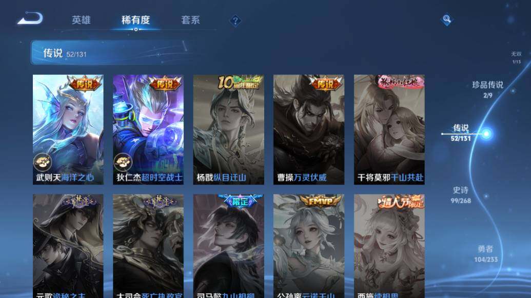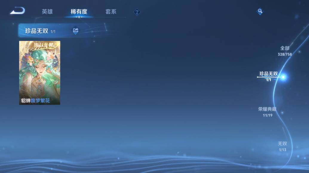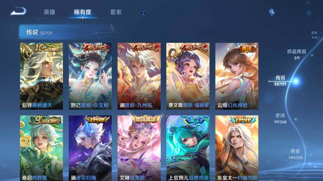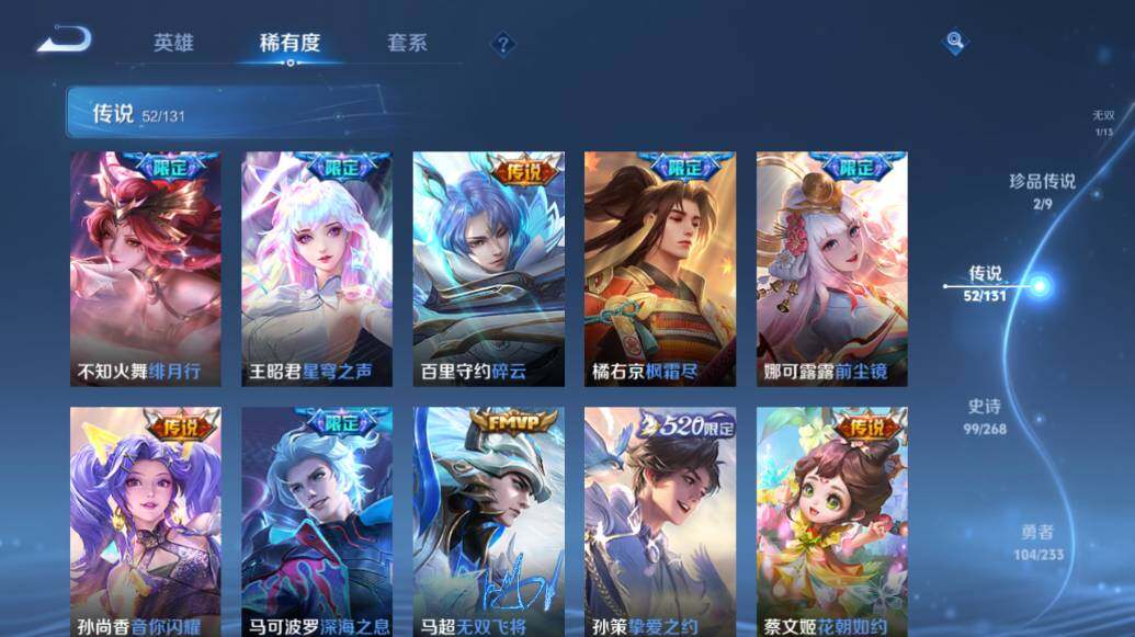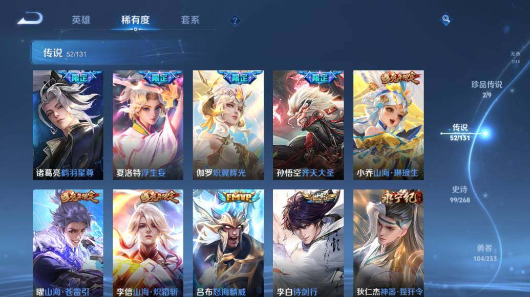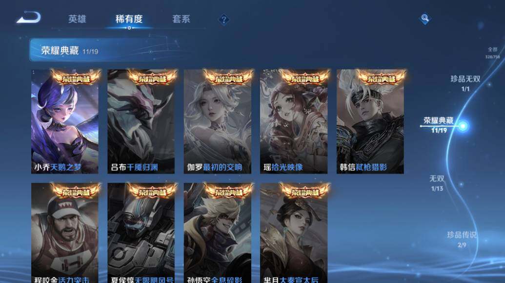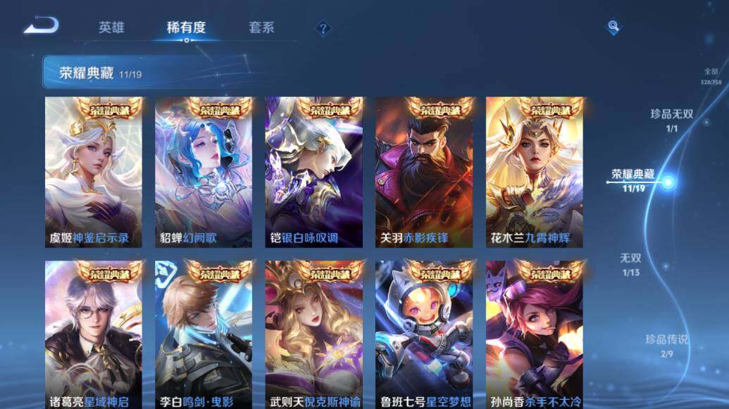 【荣耀典藏】:武则天英雄,武则天倪克斯神谕,小乔天鹅之梦,孙尚香杀手不太冷,鲁班七号星空梦想,李白鸣剑曳影,诸葛亮星域神启,花木兰九霄神辉,关羽赤影疾锋,铠银白咏叹调,貂蝉幻阙歌,虞姬神鉴启示录