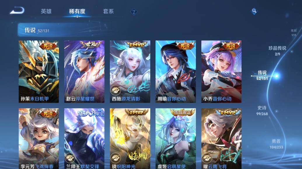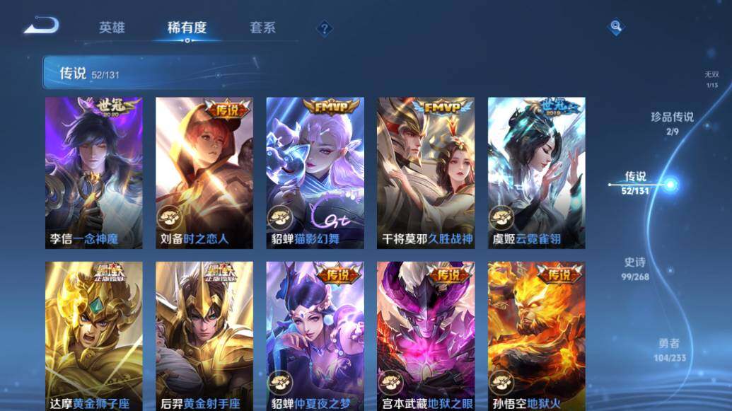 - PX_2096181-57 安卓QQ/永恒钻石/186皮肤/124英雄/1典藏/0珍品无双/0无双/2珍品传说/11传说/35史诗/9稀有英雄 【2 珍品传说】朽木白哉 暃,黑崎一护 宫本武藏, 【1 典藏皮肤】鸣剑·曳影 李白, 【11 传说皮肤】无双飞将 马超,云鹰飞将 曜,诗剑行 李白,燃星之曲 花木兰,地狱之眼 宫本武藏,鹤羽星尊 诸葛亮,战鼓燎原 典韦,超时空战士 狄仁杰,愿照·众生和