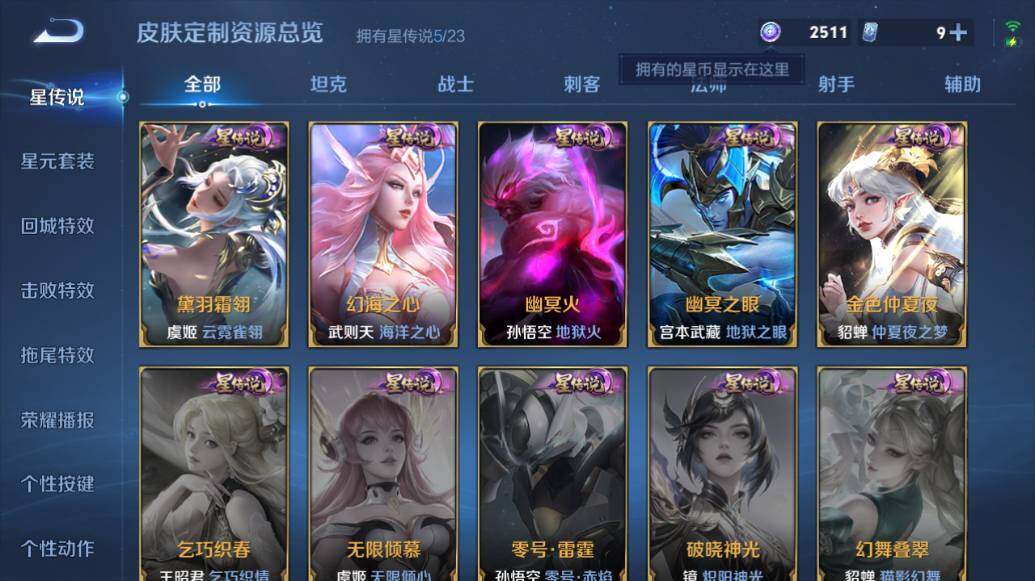【传说皮肤】:后羿神树通天,妲己愿照众生和,澜愿照九州拓,蔡文姬愿照福禄聚,云缨幻光神枪,桑启鸣野蒿,澜逐花归海,艾琳觅芳踪,上官婉儿妄想奇谈,东皇太一灼幽烈阳,诸葛亮鹤羽星尊,夏洛特浮生妄,伽罗炽翼辉光,孙悟空齐天大圣,小乔山海琳琅生,曜山海苍雷引,李信山海炽霜斩,吕布怒海麟威,李白诗剑行,狄仁杰神器狴犴令,不知火舞绯月行,王昭君星穹之声,百里守约碎云,橘右京枫霜尽,娜可露露前尘镜,孙尚香音你闪耀,马可波罗深海之息,马超无双飞将,孙策挚爱之约,蔡文姬花朝如约,孙策末日机甲,赵云淬星耀世,西施游龙清影,周瑜音你心动,小乔音你心动,李元芳飞鸢探春,兰陵王默契交锋,镜炽阳神光,虞姬启明星使,曜云鹰飞将,李信一念神魔,刘备时之恋人,貂蝉猫影幻舞,干将莫邪久胜战神,虞姬云霓雀翎,达摩黄金狮子座,后羿黄金射手座,貂蝉仲夏夜之梦,宫本武藏地狱之眼,孙悟空地狱火,武则天海洋之心,狄仁杰超时空战士