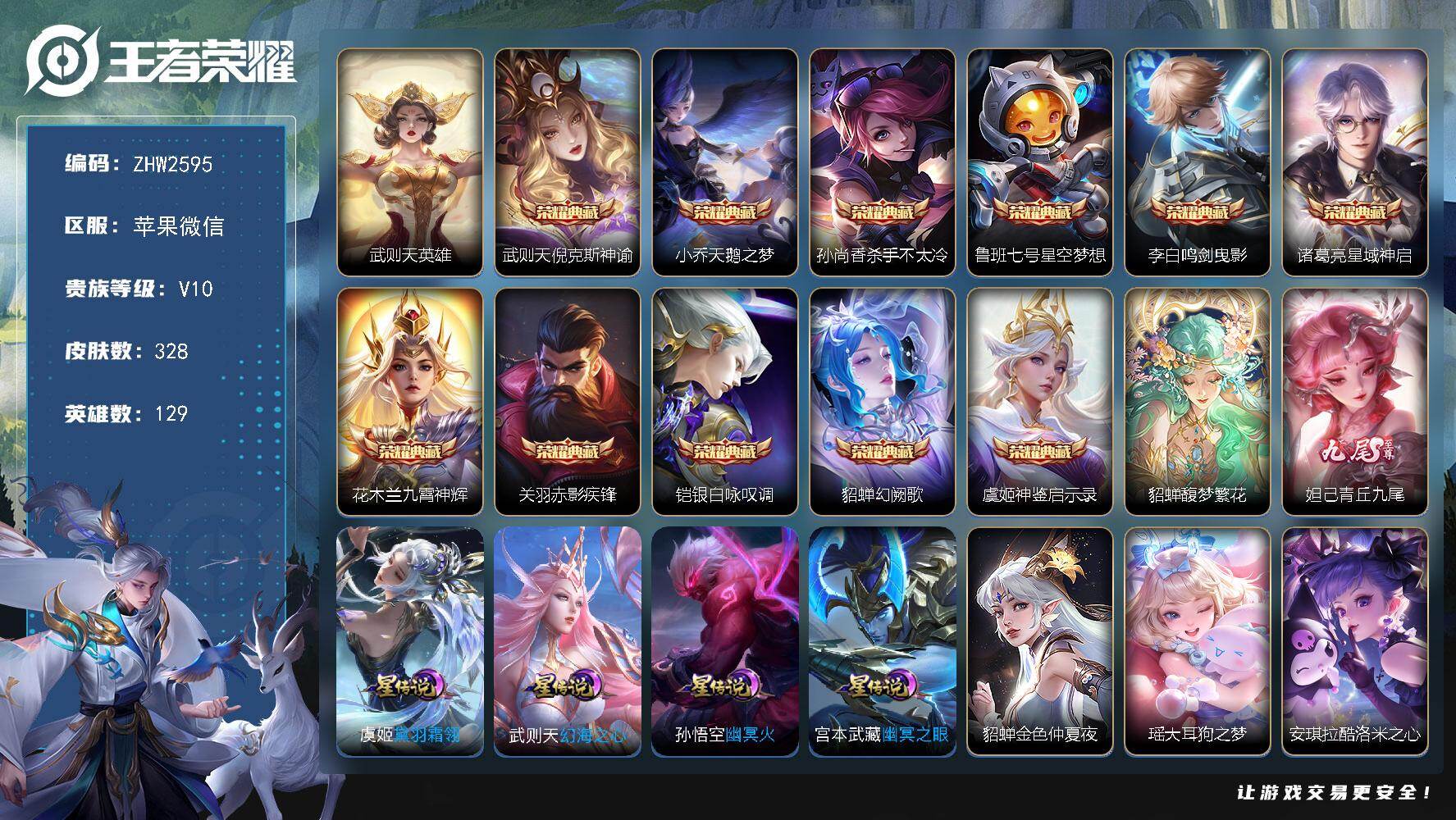 [15779960]苹果WX-V10-最强王者段位-129英雄-328皮肤-11典藏皮肤-1典藏英雄-1珍品无双-1无双-2珍品传说-52传说-98史诗-5星传说!-55按键!-3天幕!