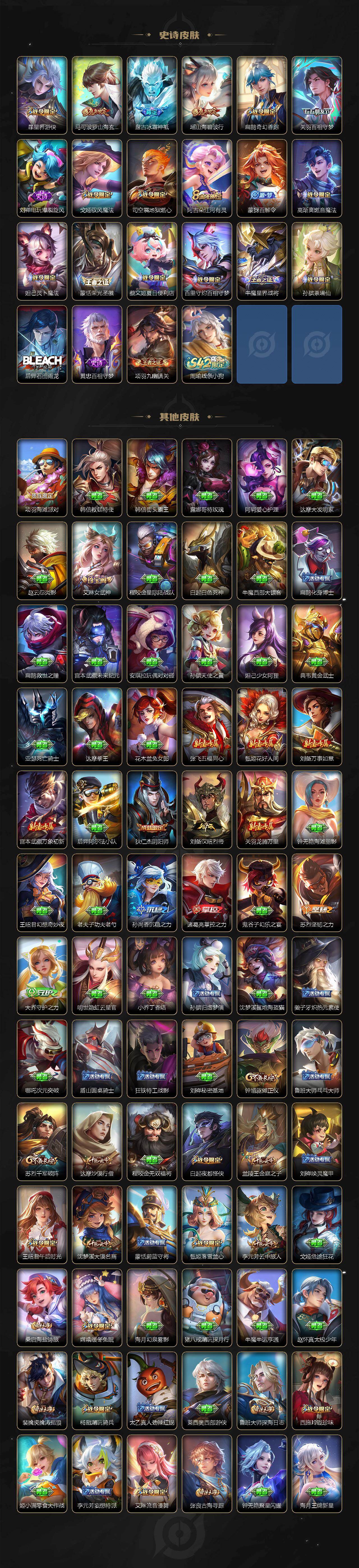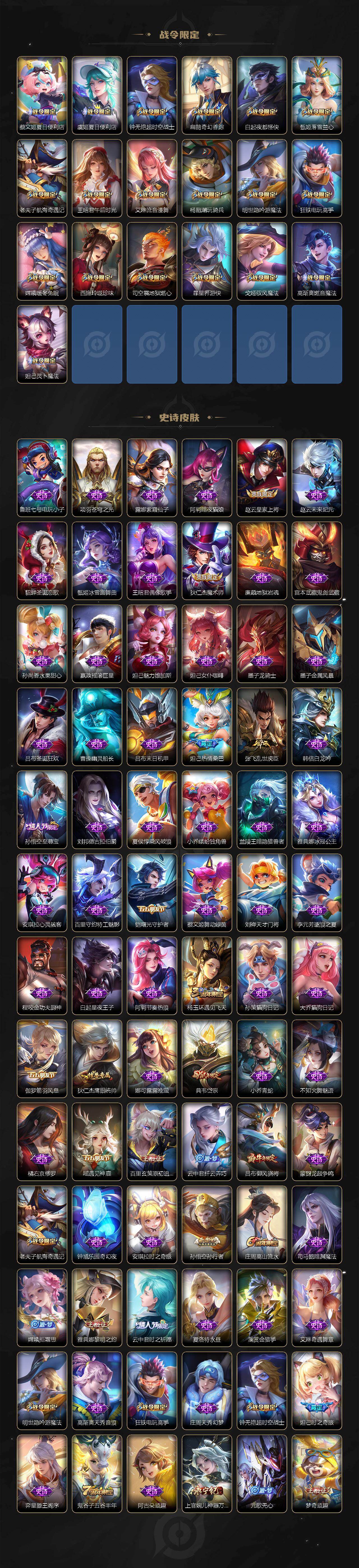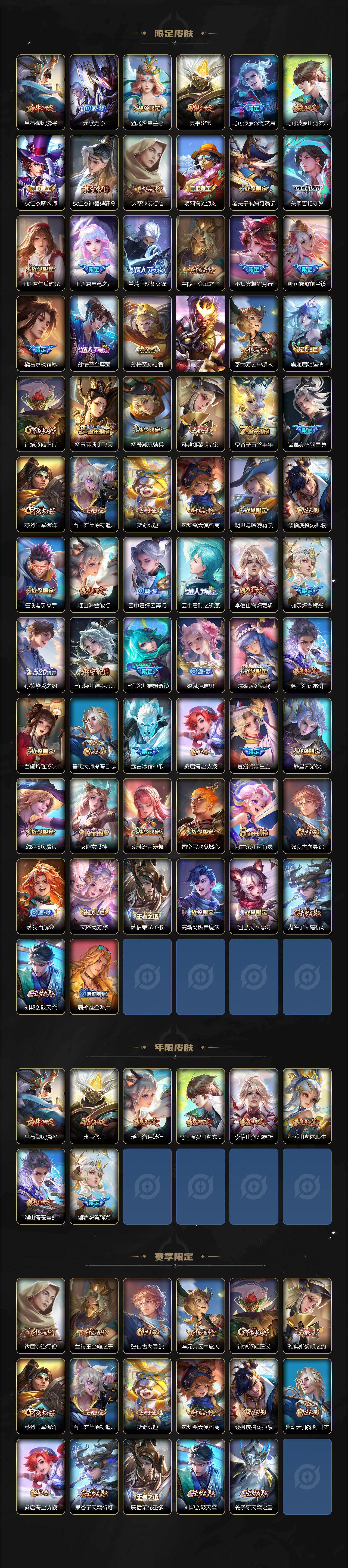 【限定皮肤】:蔡文姬夏日便利店,虞姬夏日便利店,姜子牙天穹之誓,狄仁杰阴阳师,小乔山海琳琅生,赵云皇家上将,妲己热情桑巴,妲己时之奇旅,庄周高山流水,钟无艳超时空战士,扁鹊奇幻香踪,白起夜都怪侠,吕布御风骁将,元歌无心,甄姬落雪兰心,典韦岱宗,马可波罗深海之息,马可波罗山海玄木吟,狄仁杰魔术师,狄仁杰神器狴犴令,达摩沙漠行僧,项羽海滩派对,老夫子航海奇遇记,关羽百相守梦,王昭君午后时光,王昭君星穹之声,兰陵王默契交锋,兰陵王金庭之子,不知火舞绯月行,娜可露露前尘镜,橘右京枫霜尽,孙悟空至尊宝,孙悟空孙行者,孙悟空齐天大圣,李元芳云中旅人,虞姬启明星使,钟馗驱傩正仪,杨玉环遇见飞天,杨戬潮玩骑兵,雅典娜黎明之约,鬼谷子五谷丰年,诸葛亮鹤羽星尊,苏烈千军破阵,