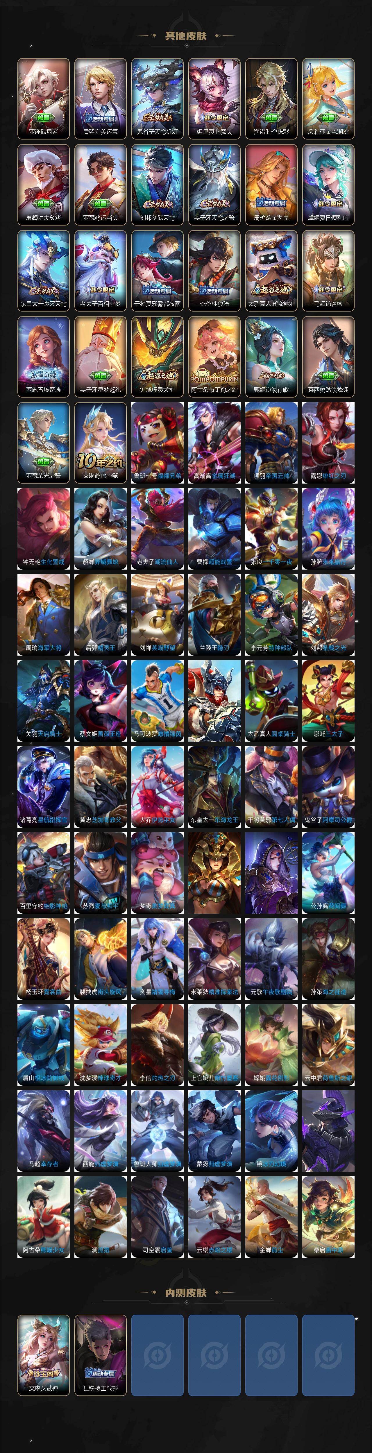 小乔青蛇,瑶遇见神鹿,娜可露露晚萤,伽罗箭羽风息,李元芳逐浪之夏,不知火舞魅语,大乔猫狗日记,孙策猫狗日记,阿轲节奏热浪,露娜紫霞仙子,王昭君偶像歌手,韩信白龙吟,项羽苍穹之光,阿轲暗夜猫娘,雅典娜冰冠公主,吕布末日机甲,鲁班七号电玩小子,蒙犽龙鼓争鸣,橘右京修罗,墨子龙骑士,嬴政摇滚巨星,刘禅天才门将,白起星夜王子,安琪拉心灵骇客,安琪拉时之奇旅,程咬金功夫厨神,刘邦德古拉伯爵,兰陵王暗隐猎兽者,曹操幽灵船长,宫本武藏鬼剑武藏,司马懿暗渊魔法,钟馗乐园奇幻夜,蔡文姬舞动绿茵,廉颇地狱岩魂,小乔缤纷独角兽,夏侯惇乘风破浪,铠曙光守护者,墨子金属风暴,百里玄策原初追逐者,吕布圣诞狂欢,貂蝉圣诞恋歌,百里守约特工魅影,嫦娥拒霜思,雅典娜黎明之约,夏洛特永昼,澜赏金猎手,艾琳奇遇舞章,高渐离天秀·音浪,庄周天秀·幻梦,弈星滕王阁序,阿古朵顽趣,关羽百相守梦,刘禅电玩·爆裂旋风,蒙犽百解令,高渐离燃音魔法