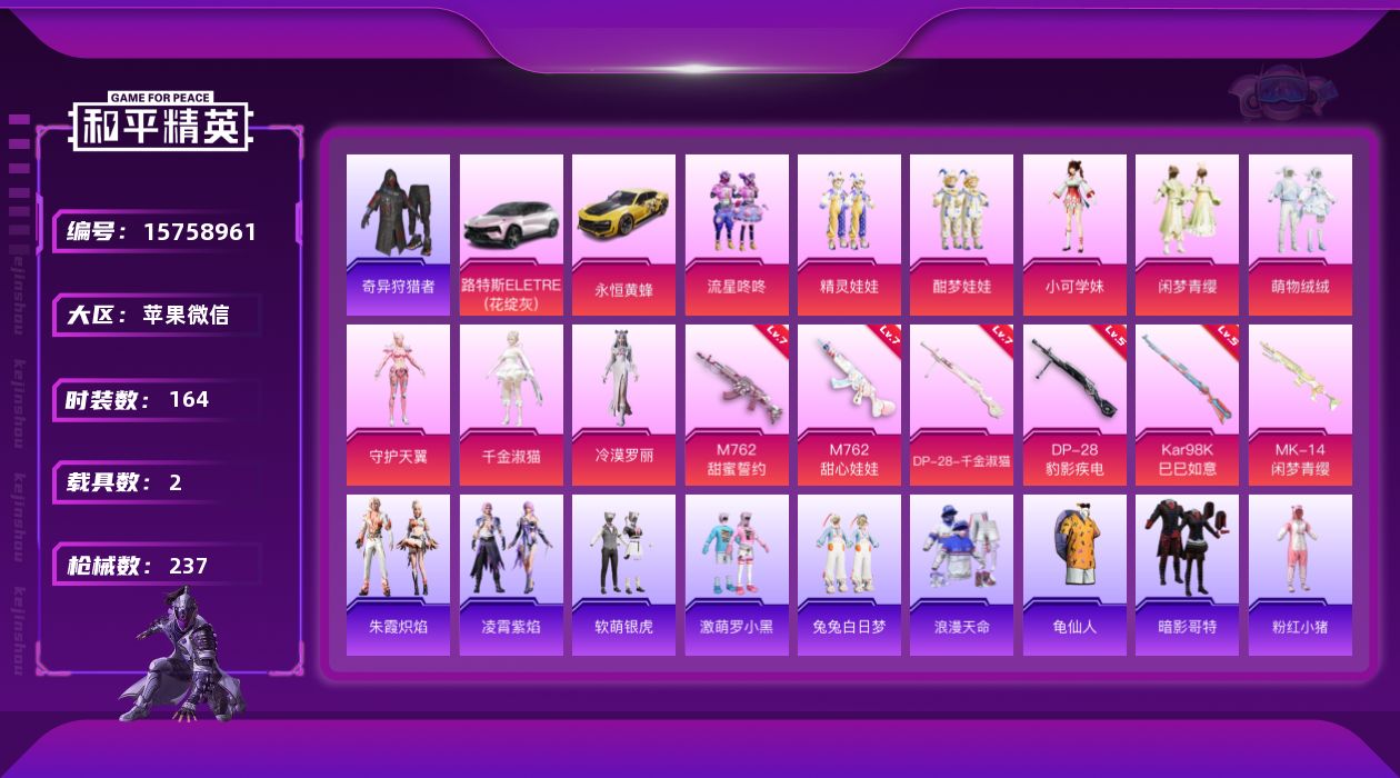[15758961]苹果 微信-9粉装-6特效枪-2载具-4粉色飞行器-78578热力值-11王牌印记-164套装-237枪皮 【热门品类】:套装-浪漫天命,套装-奇异狩猎者,套装-龟仙人,套装-暗影哥特,套装-粉红小猪,角色-Mark.06 【粉色套装】:粉装-流星咚咚,粉装-精灵娃娃,粉装-酣梦娃娃,角色-小可学妹,粉装-闲梦青缨,粉装-萌物绒绒,角色-守护天翼,角色-千金淑猫,角色-冷漠罗丽 【粉色枪皮等级】:M762-甜蜜誓约(七级),M762-甜心娃娃(七级),Kar98K-巳巳如意(五级),DP-28-千金淑猫(七级),DP-28-豹影疾电(五级) 【粉色载具】:路特斯ELETRE(花绽灰),永恒黄蜂 【粉色枪皮】:M762-甜蜜誓约,M762-甜心娃娃,Kar98K-巳巳如意,Mk14-闲梦青缨,DP-28-千金淑猫,DP-28-豹影疾电 【粉色飞行器】:梦幻火箭飞行器,天之羽翼飞行器,太空嘟嘟飞行器,萌物绒绒飞行器 【粉色降落伞】:百万伏特降落伞,神秘黑猫降落伞,甜蜜誓约降落伞,四圣焕新降落伞,心之恋语降落伞,扶摇飞仙降落伞,锦绣火鲤降落伞,荧光虫舞降落伞,甜心娃娃降落伞,天之羽翼降落伞,橘柚倾心降落伞,炫光之旅降落伞,莲影清波降落伞,蜜语绒猫降落伞,金丰海韵降落伞,千金淑猫降落伞,樱桃泡泡降落伞,星穹咏叹调降落伞,喜羊羊与灰太狼降落伞 【稀有套装】:套装-龟仙人,套装-绒宝小鹅,套装-小鸟芋圆,套装-雏菊兔兔,套装-萝兰蝴蝶,套装-小熊娃娃,套装-糖糖葫芦,套装-青团波波,角色-都市丽猫,角色-摩登魅猫,套装-燕燕于飞,套装-鱼渊荷华,角色-糖霜甜心,角色-蜜桃派对,套装-萌萌史莱姆,套装-粉恋花,套装-紫幽梦,套装-蓝冰羽,套装-星影赞美诗,套装-星渊小夜曲,套装-彩虹兔,套装-云朵鹅,套装-雪绒豹,套装-蜜露汐语,套装-朱霞炽焰,套装-凌霄紫焰 【稀有枪皮】:AKM-夜灯,AKM-彩虹符号,AKM-虎虎生威,AKM-锦绣火鲤,AKM-霓虹街区,AKM-龙的传人,M16A4-幻世战舞者,M16A4-红色方程式,M16A4-千金淑猫,SCAR-L-流星咚咚,SCAR-L-炫彩节奏,SCAR-L-玉兔迎春,SCAR-L-甜蜜誓约,M416-摩登王国,M416-暗星紫秘,M416-神秘黑猫,M416-糯团青竹,M416-蓝色火焰,M416-萌萌史莱姆,GROZA-异彩先