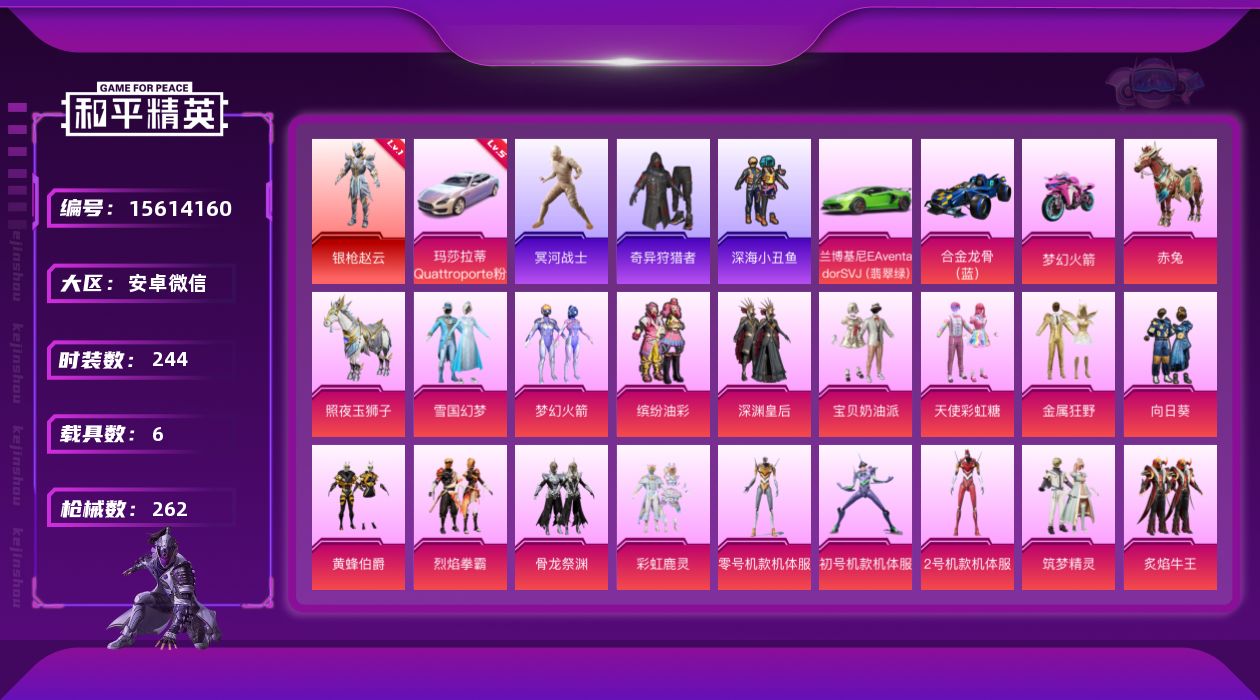 [15614160]送手机!54个轿车组件差6个升满级玛莎!安卓 微信-1神装-19粉装-12特效枪-6载具-5粉色飞行器-118217热力值-23王牌印记-244套装-262枪皮 【红色载具】:玛莎拉蒂Quattroporte(幻星粉)(五级) 【红色神装等级】:角色-银枪赵云(一级) 【红色角色神装】:角色-银枪赵云 【热门品类】:粉装-雪国幻梦,粉装-梦幻火箭,粉装-缤纷油彩,套装-浪漫天命,套装-冥河战士,套装-深海小丑鱼,套装-奇异狩猎者,角色-军刀雅典娜,套装-金羽特工,角色-忠义严颜,套装-龟仙人,套装-暗影哥特,套装-浪漫波比,套装-粉红小猪,大砍刀-青龙偃月刀,撬棍-龙胆亮银枪 【粉色套装】:粉装-深渊皇后,粉装-宝贝奶油派,粉装-天使彩虹糖,粉装-雪国幻梦,粉装-梦幻火箭,粉装-金属狂野,粉装-缤纷油彩,粉装-向日葵,粉装-黄蜂伯爵,粉装-烈焰拳霸,粉装-骨龙祭渊,粉装-彩虹鹿灵,角色-零号机款机体服,角色-初号机款机体服,角色-2号机款机体服,粉装-筑梦精灵,粉装-炙焰牛王,粉装-星夜魔法师,粉装-闲梦青缨 【粉色枪皮等级】:AKM-甜心宝贝(四级),SCAR-L-梦幻火箭(七级),M416-心之恋语(一级),M416-风花雪月(二级),M416-至情至圣(九级),GROZA-焦糖拿铁(五级),UZI-筑梦精灵(四级),Kar98K-巳巳如意(五级),Mini14-荧光虫舞(三级),DP-28-豹影疾电(一级),MG3-炙焰牛王(四级),平底锅-林间仙鹿(三级) 【粉色载具】:兰博基尼Aventador SVJ(翡翠绿),玛莎拉蒂Quattroporte(幻星粉),合金龙骨(蓝),双人摩托-梦幻火箭,僚机-萌兔起飞,赤兔,照夜玉狮子 【粉色枪皮】:AKM-甜心宝贝,SCAR-L-梦幻火箭,M416-心之恋语,M416-风花雪月,M416-至情至圣,GROZA-焦糖拿铁,UZI-筑梦精灵,Kar98K-巳巳如意,Mini14-荧光虫舞,DP-28-豹影疾电,MG3-炙焰牛王,平底锅-林间仙鹿 【粉色飞行器】:梦幻火箭飞行器,炫紫旋律飞行器,齐天大圣飞行器,风花雪月飞行器,星夜魔法师飞行翼 【粉色降落伞】:百万伏特降落伞,甜心宝贝降落伞,梦幻火箭降落伞,神秘黑猫降落伞,古堡领主降落伞,四圣焕新降落伞,锦绣火鲤降落伞,荧光虫舞降落伞,暗夜玫瑰降落伞,林间仙鹿降落伞,洛
