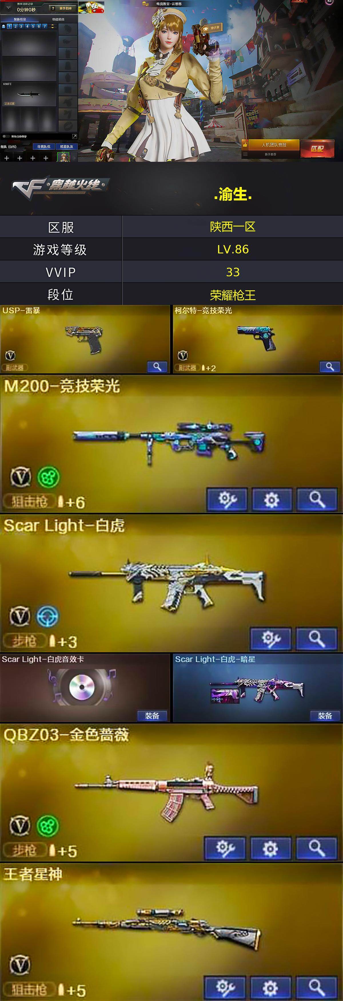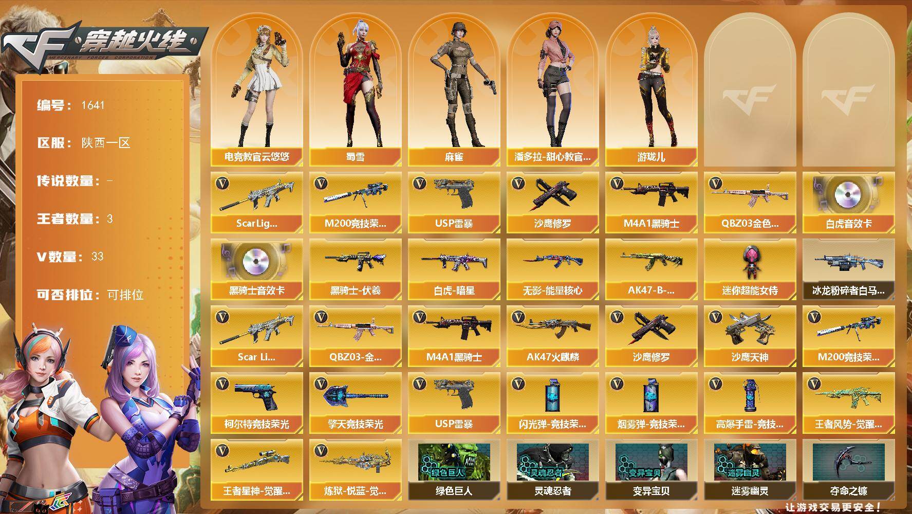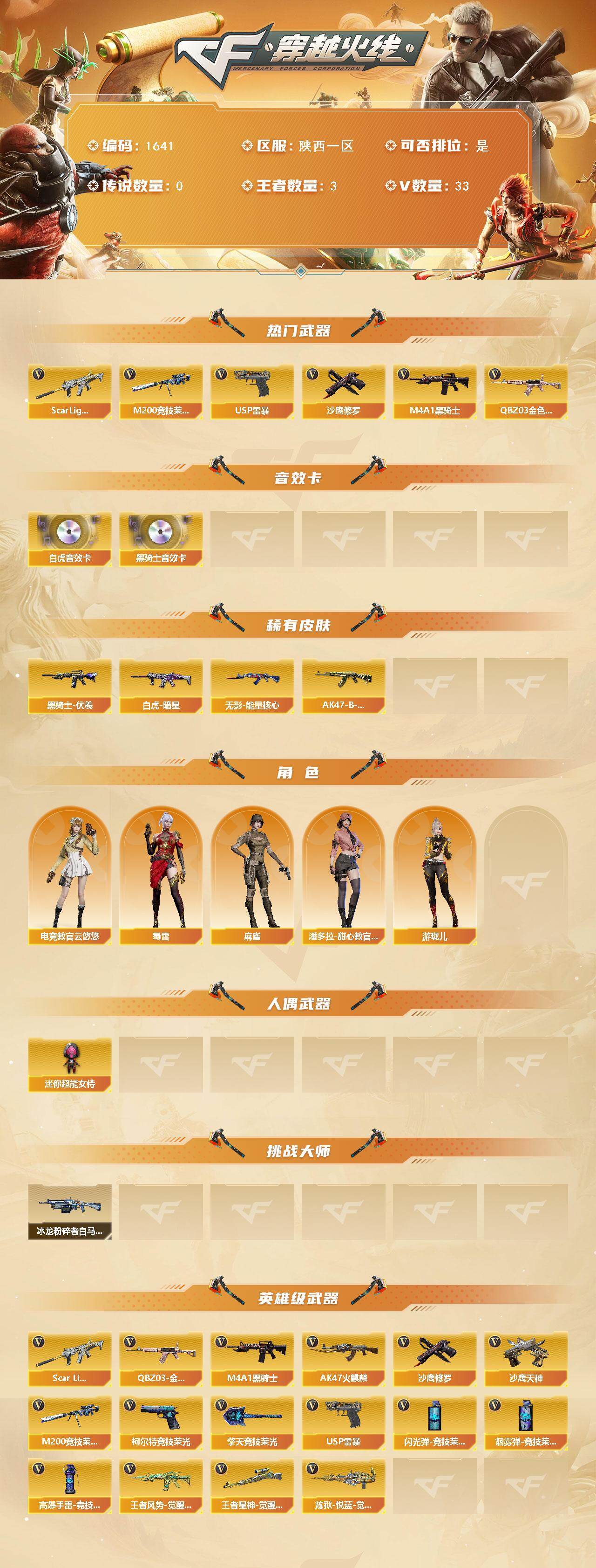 [15744700]陕西一区-33V-3王者-0炫金 【热门武器】:QBZ03-金色蔷薇,Scar Light-白虎,M200-竞技荣光,M4A1-黑骑士,USP-雷暴,沙鹰-修罗*2 【音效卡】:M4A1-黑骑士音效卡,Scar Light-白虎音效卡 【皮肤】:Scar Light-白虎-暗星,黑骑士-伏羲,无影-能量核心,AK47-B-常胜将军-孙权 【角色】:电竞教官-云悠悠,麻雀,潘多拉-甜心教官,蜀雪,游珑儿 【人偶武器】:迷你超能女侍 【挑战大师】:冰龙粉碎者-白马银枪 【英雄级武器】:AK47-火麒麟,M4A1-黑骑士,Scar Light-白虎,QBZ03-金色蔷薇,王者风势-觉醒版,M200-竞技荣光,王者星神-觉醒版,炼狱-悦蓝-觉醒版,沙鹰-修罗*2,沙鹰-天神,USP-雷暴,柯尔特-竞技荣光,擎天-竞技荣光,高爆手雷-竞技荣光*7,闪光弹-竞技荣光*7,烟雾弹-竞技荣光*7 【道具】:绿色巨人,灵魂忍者*2,变异宝贝,迷雾幽灵,夺命之镰,防化服*2,金色流光-枪王排位*2,电玩兔兔表情,防弹头盔*5,防弹衣*5,C4工具钳*5,手雷包*5 【特殊枪械】:1白虎,1黑骑士