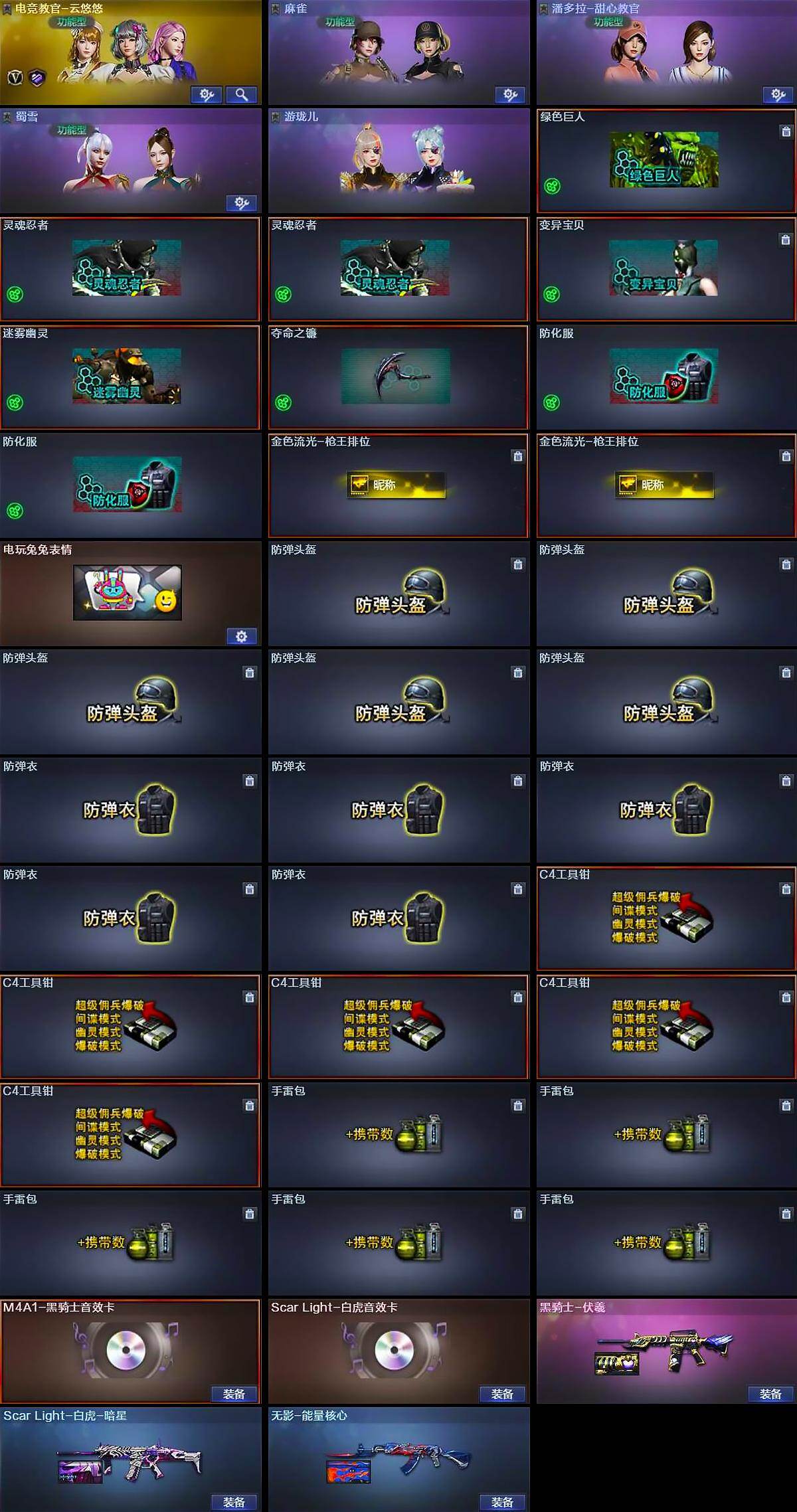 【道具】:绿色巨人,灵魂忍者*2,变异宝贝,迷雾幽灵,夺命之镰,防化服*2,金色流光-枪王排位*2,电玩兔兔表情,防弹头盔*5,防弹衣*5,C4工具钳*5,手雷包*5