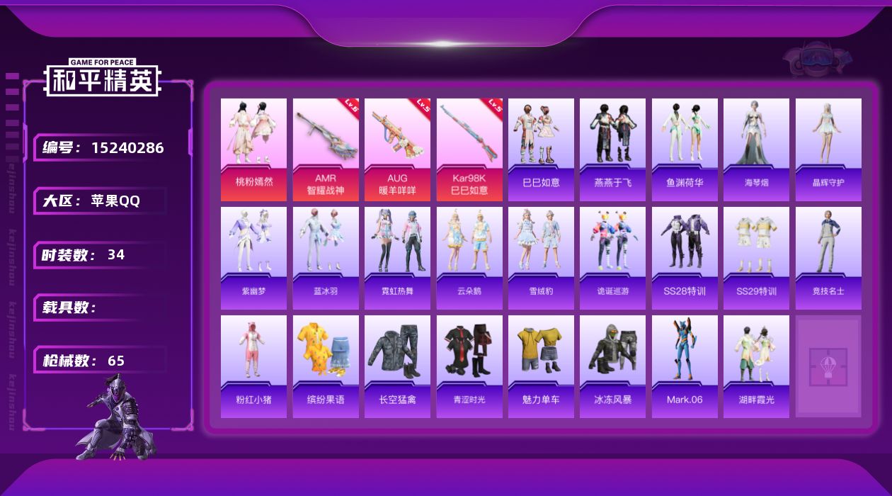 [15240286]地铁满天赋苹果 手Q-1粉装-4特效枪-1.7w热力值-1印记-34套装-65枪皮【特效枪等级】:AUG-暖羊咩咩(五级),Kar98K-巳巳如意(五级),AMR-智耀战神(六级)【优质套装】:粉装-桃粉嫣然