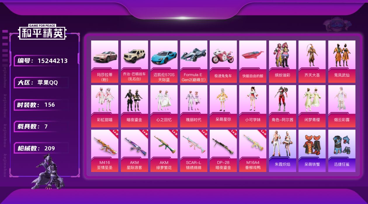 [15244213]M416-至情至圣(九级)/地铁满天赋【特价急出/详情看图】:苹果 手Q-12粉装-6特效枪-7载具-5粉色飞行器-7.6w热力值-14王牌印记-156套装-209枪皮【热门品类】:粉装-缤纷油彩,套装-龟仙人,套装-粉红小猪【粉色载具】:玛莎拉蒂Ghibli(粉),乔治巴顿战车(乳石白),迈凯伦570S(天际蓝),Formula E Gen2(巅峰兰),极速兔兔车,僚机-萌兔起飞,快艇-自由的鲸【粉色套装】:粉装-缤纷油彩,粉装-齐天大圣,粉装-鸾凤武仙,粉装-彩虹甜喵,粉装-暗夜鎏金,粉装-心之回忆,粉装-瑰丽时代,角色-呆萌星弥,角色-小可学妹,角色-阿尔茜,粉装-闲梦青缨,角色-烟云彩露【粉色枪皮等级】:AKM-星际浪客(六级),AKM-绿萝繁花(五级),M16A4-垂柳戏鸭(四级),SCAR-L-锦绣绵绵(五级),M416-至情至圣(九级),DP-28-暗夜鎏金(五级)【粉色飞行器】:齐天大圣飞行器,梦幻舞会飞行器,变形金刚飞行器,沙丘之主天马,冠军兔兔飞行器
