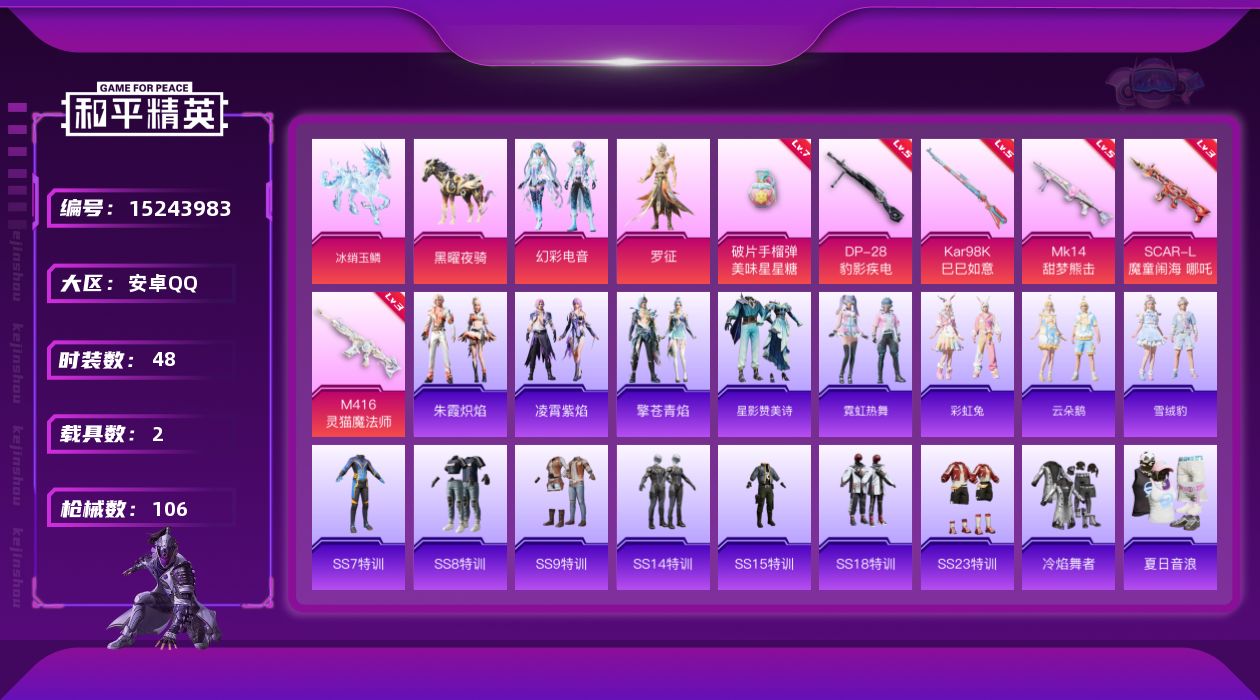[15243983]素材身法号/无敌战神框1/绝世印记2/璀璨碎片1811/扭蛋碎片452/地铁满天赋【特价急出/详情看图】:安卓 手Q-无敌战神框-2粉装-6特效枪-2载具-4粉色飞行器-3.3w热力值-4王牌印记-48套装-106枪皮【粉色载具】:黑曜夜骑,冰绡玉鳞【粉色套装】:粉装-幻彩电音,角色-罗征【粉色枪皮等级】:SCAR-L-魔童闹海 哪吒(三级),M416-灵猫魔法师(三级),Kar98K-巳巳如意(五级),Mk14-甜梦熊击(五级),DP-28-豹影疾电(五级),破片手榴弹-美味星星糖(七级)【粉色飞行器】:终晖之翼飞行器,灵猫魔法师飞行器,飞天猪飞行器,灵珠游龙飞行器