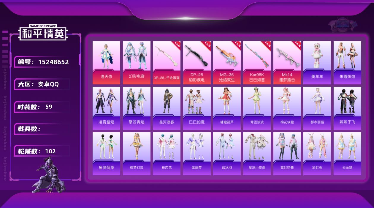[15248652]地铁满天赋【特价急出/详情看图】:安卓 手Q-2粉装-5特效枪-2.9w热力值-5王牌印记-59套装-102枪皮【热门品类】:套装-星河浪客【粉色套装】:角色-洛天依,粉装-幻彩电音【粉色枪皮等级】:Kar98K-巳巳如意(五级),Mk14-甜梦熊击(五级),DP-28-千金淑猫(六级),DP-28-豹影疾电(五级),MG-36-沧焰双生(五级)
