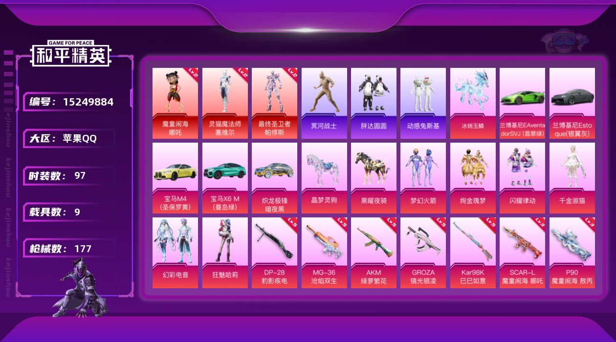 [15249884]素材身法号/老木乃伊/绝世印记1【特价急出/详情看图】:苹果 手Q-3神装-6粉装-9特效枪-9载具-8粉色飞行器-6.6w热力值-8王牌印记-97套装-177枪皮【红色神装等级】:魔童闹海-哪吒(二级),灵猫魔法师-塞维尔(二级),最终圣卫者-帕修斯(二级)【热门品类】:粉装-梦幻火箭,套装-冥河战士,套装-胖达圆圆,套装-动感兔斯基人偶服,套装-粉红小猪,套装-红熊茄茄【粉色载具】:兰博基尼Aventador SVJ(翡翠绿),兰博基尼Estoque(银翼灰),宝马M4(圣保罗黄),宝马X6 M(曼岛绿),炽龙极锋(暗夜黑),僚机-冰龙团团,晶梦灵驹,黑曜夜骑,冰绡玉鳞【粉色套装】:粉装-梦幻火箭,粉装-绚金瑰梦,粉装-闪耀律动,角色-千金淑猫,粉装-幻彩电音,角色-狂魅哈莉【粉色枪皮等级】:AKM-绿萝繁花(五级),AKM-幽焰骑士(三级),SCAR-L-魔童闹海 哪吒(三级),GROZA-镜光银凌(五级),Vector-最终圣卫者(三级),P90-魔童闹海 敖丙(三级),Kar98K-巳巳如意(五级),DP-28-豹影疾电(五级),MG-36-沧焰双生(五级)【粉色飞行器】:天之羽翼飞行器,龙翔九天飞行器,幽焰列车飞行器,终晖之翼飞行器,灵猫魔法师飞行器,飞天猪飞行器,灵珠游龙飞行器