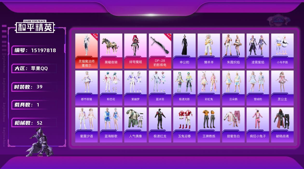 [15197818]可二次【店主推荐捡漏号!可直接换绑】/素材身法号/扭蛋碎片842 苹果 手Q-1神装-1粉装-1特效枪-1载具-3粉色飞行器-1.8w热力值-2王牌印记-39套装-52枪皮【红色神装等级】:灵猫魔法师-塞维尔(二级)【粉色载具】:黑曜夜骑【粉色套装】:角色-绯穹魔姬【粉色枪皮等级】:DP-28-豹影疾电(一级)【粉色飞行器】:智趣喵喵飞行器,灵猫魔法师飞行器,飞天猪飞行器