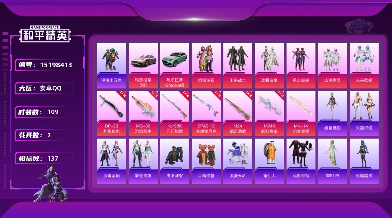 [15198413]【店主推荐捡漏号!可直接换绑】/素材身法号/扭蛋碎片531/地铁满天赋 安卓 手Q-6粉装-7特效枪-2载具-1粉色飞行器-4.6w热力值-8王牌印记-109套装-137枪皮【热门品类】:粉装-缤纷油彩,套装-浪漫天命,套装-深海小丑鱼,套装-龟仙人,套装-暗影哥特【粉色载具】:玛莎拉蒂Ghibli(粉),玛莎拉蒂Grecale(薄荷绿)【粉色套装】:粉装-未来战士,粉装-缤纷油彩,粉装-冰霜白皇,粉装-星之彼岸,粉装-山涧鹿灵,粉装-未来歌姬【粉色枪皮等级】:Kar98K-巳巳如意(五级),M24-翩跹演武(四级),SPAS-12-音爆索尼克(五级),M249-彩虹甜喵(四级),DP-28-豹影疾电(五级),MG-36-沧焰双生(五级)