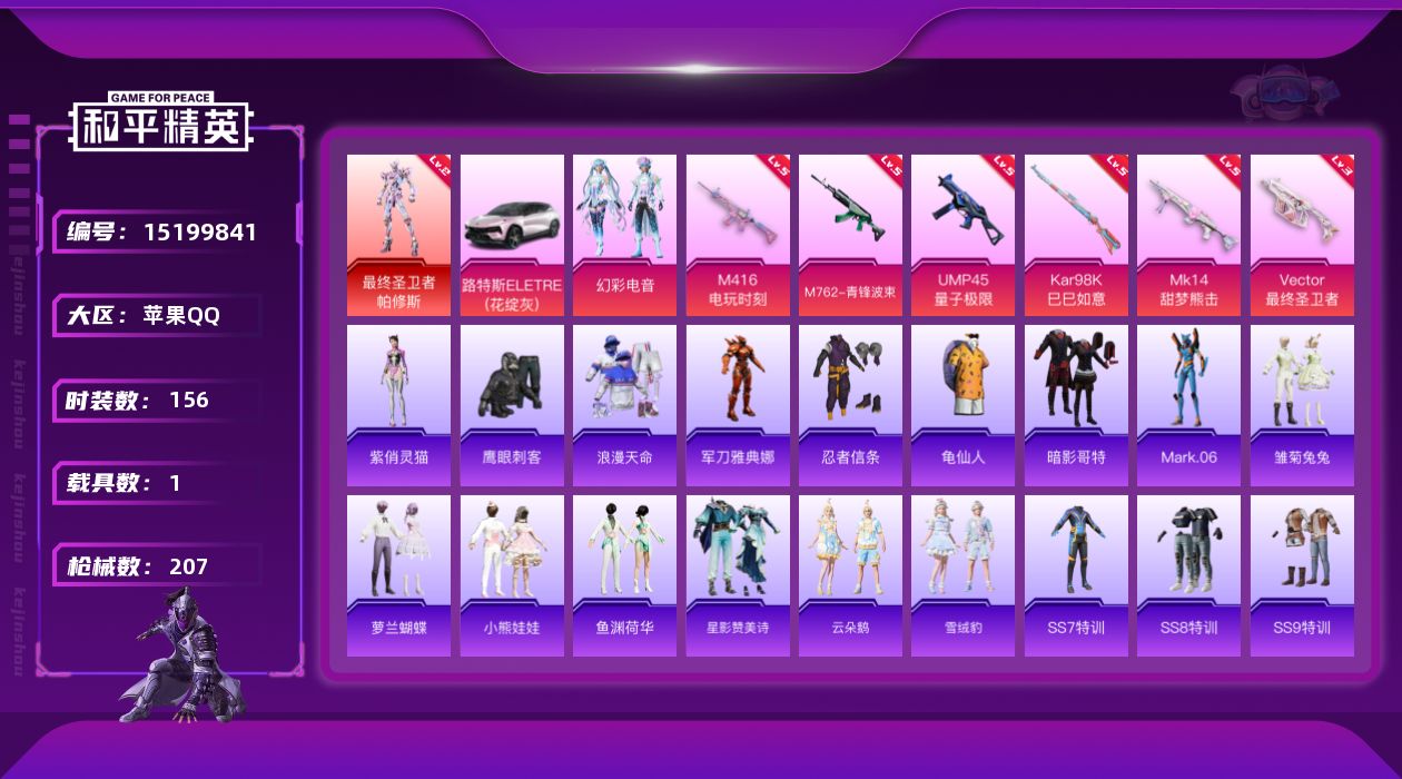 [15199841]【店主推荐捡漏号!可直接换绑】/素材身法号 苹果 手Q-1神装-1粉装-6特效枪-1载具-2粉色飞行器-6.3w热力值-13王牌印记-156套装-207枪皮【红色神装等级】:最终圣卫者-帕修斯(二级)【热门品类】:套装-浪漫天命,角色-军刀雅典娜,套装-忍者信条,套装-龟仙人,套装-暗影哥特,角色-Mark.06【粉色载具】:路特斯ELETRE(花绽灰)【粉色套装】:粉装-幻彩电音【粉色枪皮等级】:M416-电玩时刻(五级),M762-青锋波束(五级),UMP45-量子极限(五级),Vector-最终圣卫者(三级),Kar98K-巳巳如意(五级),Mk14-甜梦熊击(五级)【粉色飞行器】:终晖之翼飞行器