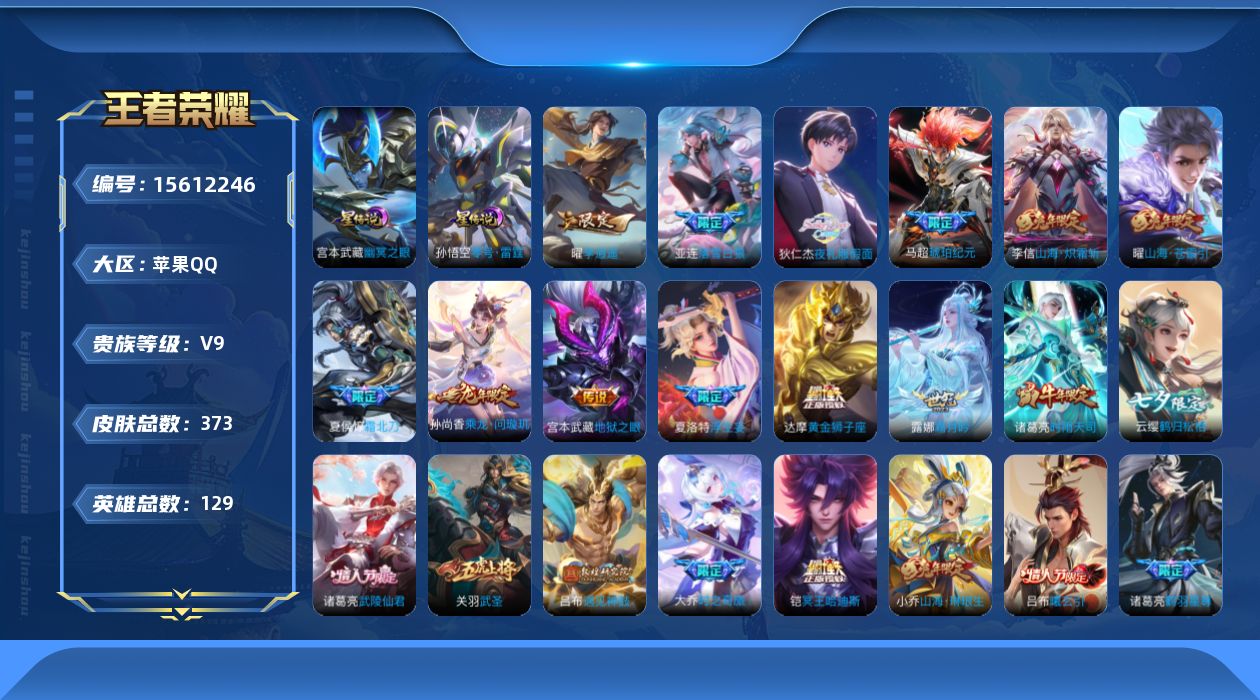[15612246]【店主推荐捡漏号!可直接换绑】苹果Q-V9-最强王者段位-128英雄-369皮肤-50传说-99史诗-3星元 【英雄全皮】:刘禅全皮,狂铁全皮,猪八戒全皮,金蝉全皮,海诺全皮 【荣耀典藏】:武则天英雄 【传说皮肤】:夏侯惇霜北刀,铠冥王哈迪斯,亚连落雪白狼,吕布曦玄引,貂蝉曦玄引,孙尚香乘龙问璇玑,马超琥珀纪元,露娜霜月吟,狄仁杰夜礼服假面,甄姬至美化雀舞,大乔时之奇旅,鲁班七号时之奇旅,兰陵王影龙天霄,吕布遇见神鼓,云缨鹤归松栖,上官婉儿妄想奇谈,马可波罗妄想实况,诸葛亮鹤羽星尊,夏洛特浮生妄,干将莫邪画中仙,花木兰燃星之曲,虞姬无限倾心,项羽无限倾心,伽罗炽翼辉光,孙悟空齐天大圣,小乔山海琳琅生,曜山海苍雷引,李信山海炽霜斩,吕布怒海麟威,李白诗剑行,狄仁杰神器狴犴令,王昭君星穹之声,百里守约碎云,橘右京枫霜尽,孙策挚爱之约,鲁班七号寅虎瑞焰,赵云淬星耀世,王昭君乞巧织情,曜李逍遥 ,诸葛亮时雨天司,铠绛天战甲,虞姬启明星使,孙悟空零号赤焰,关羽武圣,刘备时之恋人,干将莫邪久胜战神,达摩黄金狮子座,后羿黄金射手座,诸葛亮武陵仙君,宫本武藏地狱之眼 【限定皮肤】:夏侯惇霜北刀,铠冥王哈迪斯,大乔绒语心约,姜子牙天穹之誓,狄仁杰阴阳师,小乔山海琳琅生,赵云皇家上将,赵云引擎之心,赵云龙胆,赵云百木心枪,墨子神迹守卫,墨子降魔,嬴政优雅恋人,鲁班七号乒乒小将,鲁班七号寅虎瑞焰,鲁班七号时之奇旅,庄周高山流水,高渐离玩趣恶龙,钟无艳超时空战士,扁鹊奇幻香踪,白起夜都怪侠,吕布御风骁将,吕布遇见神鼓,元歌云间偶戏,元歌无心,夏侯惇朔风刀,甄姬落雪兰心,甄姬至美化雀舞,典韦穷奇,典韦岱宗,马可波罗暗影游猎,马可波罗山海玄木吟,马可波罗妄想实况,狄仁杰魔术师,狄仁杰万华元夜,狄仁杰神器狴犴令,达摩星际陆战队,达摩沙漠行僧,项羽海滩派对,项羽无限倾心,老夫子醍醐杖,老夫子航海奇遇记,关羽冰锋战神,关羽武圣,程咬金演武夺筹,韩信逐梦之影,韩信飞衡,韩信傲雪梅枪,王昭君午后时光,王昭君星穹之声,兰陵王影龙天霄,兰陵王金庭之子,花木兰青春决赛季,花木兰燃星之曲,橘右京枫霜尽,亚瑟潮玩骑士王,孙悟空美猴王,孙悟空至尊宝,孙悟空大圣娶亲,孙悟空零号赤焰,孙悟空孙行者,孙悟空齐天大圣,牛魔御旌,后羿如梦令,张飞虎魄,李元芳云中旅人,虞姬启明星使,虞姬无限倾心,钟馗驱傩正仪,杨玉环遇见飞天