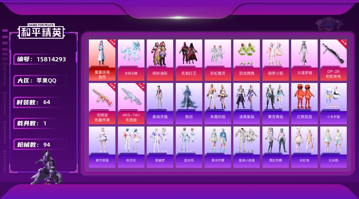[15814293]【特价出售/店主推荐】苹果 手Q-1神装-6粉装-3特效枪-1载具-4粉色飞行器-32493热力值-4王牌印记-64套装-94枪皮