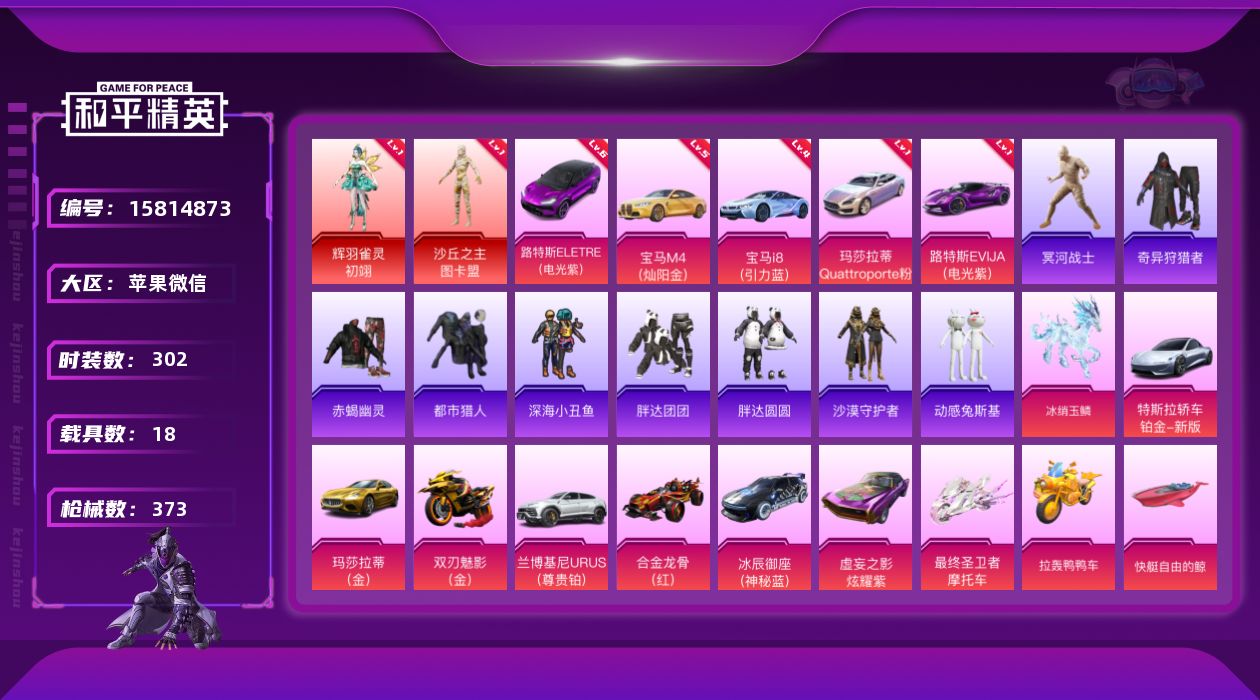 [15814873]【特价出售/店主推荐】王者附带v10 极品身法素材男神号!苹果 微信-3神装-66粉装-43特效枪-18载具-18粉色飞行器-221582热力值-19王牌印记-302套装-373枪皮【红色载具】:路特斯ELETRE(电光紫)(六级),路特斯EVIJA(电光紫)(一级),玛莎拉蒂Quattroporte(幻星粉)(一级),宝马M4(灿阳金)(五级),宝马i8(引力蓝)(四级)【红色神装等级】:暮色玫影-艾丽娅(五级),辉羽雀灵-初翊(一级),沙丘之主-图卡盟(一级)【红色角色神装】:暮色玫影-艾丽娅,辉羽雀灵-初翊,沙丘之主-图卡盟【热门品类】:粉装-怪诞乔克,粉装-雪国幻梦,粉装-梦幻火箭,粉装-童趣迷兔,粉装-缤纷油彩,套装-浪漫天命,套装-赤蝎幽灵,套装-都市猎人,套装-冥河战士,套装-深海小丑鱼套装-小丑鱼,套装-奇异狩猎者,套装-胖达团团,套装-胖达圆圆,套装-沙漠守护者,套装-动感兔斯基人偶服,套装-SS1特训,套装-潮萌小黄鸭,套装-暗影哥特,熔岩游骑兵连帽夹克【粉色套装】:粉装-怪诞乔克,粉装-甜心巧克力,粉装-宝贝奶油派,粉装-天使彩虹糖,粉装-金曜白虎,粉装-雪国幻梦,粉装-蝶舞迷情,粉装-梦幻火箭,粉装-金属狂野,粉装-缤彩,粉装-放客神游,粉装-新星烈龙,粉装-冰霜白皇,粉装-童趣迷兔,粉装-炙焰红王,粉装-馨动时刻,粉装-暗夜玫瑰,粉装-彩虹鹿灵,粉装-山涧鹿灵,角色-洛天依,粉装-花影珊,粉装-俏雪含霜,粉装-吟月归客,粉装-红伞翩翩,粉装-黄伞悠悠,粉装-黑伞漫漫,粉装-海渊国主,角色-初号机款机体服,粉装-蓝莓炮弹,粉装-幻情紫藤,粉装-绚金瑰梦,粉装娃娃,粉装-精灵娃娃,粉装-酣梦娃娃,粉装-天之羽翼,粉装-焦糖拿铁,粉装-碧影闪光,粉装-岚岚物语,粉装-海盐物语,粉装-薄荷物语,粉装-橘柚倾心,粉装-妙趣可丽,粉装暖熊萌萌,粉装-霁雪冰心,粉装-灵感创作师,粉装-彩虹甜喵,粉装-冰川粉黛,粉装-冰川幽秘,粉装-冰川红玫,粉装-暗夜鎏金,粉装-苔丝玫瑰,粉装-第五大道,粉装-心之回忆,色-白勺歌姬,角色-呆萌星弥,角色-小可学妹,角色-水仙星,角色-小叽联名款,角色-樱桃泡泡,粉装-绯果甜心,粉装-百变魔方,粉装-星穹咏叹调,粉装-幻彩电音,角色-狂魅哈莉角色-冷漠罗丽,角色-荧海星豚【粉色枪皮等级】:AKM-甜心宝贝(一级),A