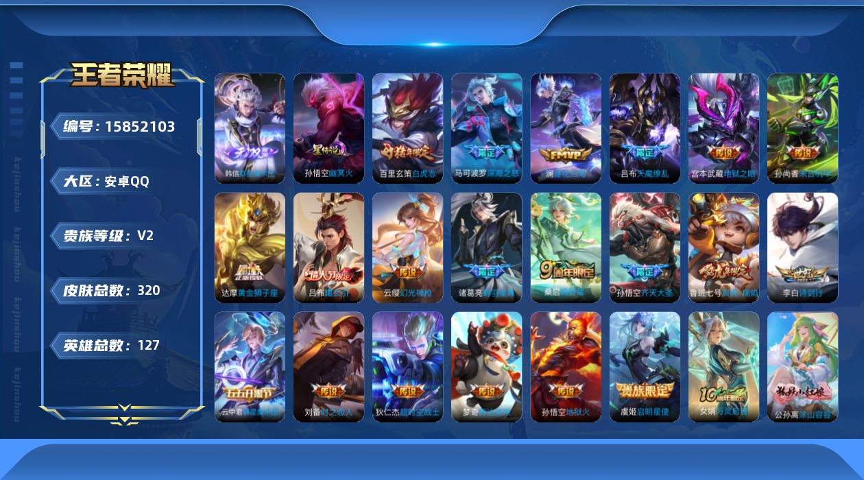 - PX_2114137-安卓QQ-有二次-贵7-122英雄-120皮肤-5传说-40限定-1按键-灵宝-3印记-2.3万贵族积分-营地1762589807-热门皮肤-马超无双飞将,李白诗剑行,干将莫邪画中仙,孙悟空齐天大圣,曜云鹰飞将,关羽百相守梦,马可波罗山海·玄木吟,韩信傲雪梅枪