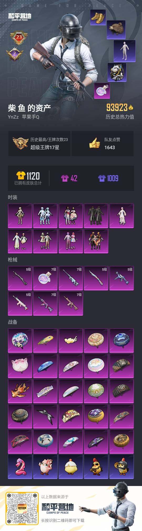 - [16380445]安卓 手Q-21粉装-17特效枪-5载具-8粉色飞行器-148654热力值-22王牌印记-289套装-429枪皮 【热门品类】:粉装-缤纷油彩,绝对防御上衣,套装-都市猎人,角色-军刀雅典娜,旭日初心兜帽大衣,套装-龟仙人,套装-粉红小猪 【粉色套装】:角色-绝对恒星,粉装-缤纷油彩,粉装-王牌四分卫,粉装-星之彼岸,粉装-馨动时刻,粉装-暗夜玫瑰,粉装-彩虹鹿灵,粉装-山涧鹿灵,粉装-妙趣可丽,粉装-心之回忆,粉装-纯珍童话,角色-呆萌星弥,角色-圣堂之誓,角色-美雪,角色-光极星,套装-创世·救赎,角色-千金淑猫,角色-晶梦幻蝶,角色-樱桃泡泡,粉装-星穹咏叹调,粉装-幻彩电音 【粉色枪皮等级】:AKM-星际浪客(七级),SCAR-L-锦绣绵绵(五级),M416-五爪金龙(七级),GROZA-镜光银凌(五级),AUG-暖羊咩咩(五级),ARX-无垠阁(六级),UMP45-量子极限(五级),AKS-74U-信仰神谕(七级),AKS-74U-森灵之息(五级),Kar98K-巳巳如意(五级),Mk14-盛世惊鸿(三级),Mk14-樱桃泡泡(七级),M249-绝对恒星(五级),DP-28-暗夜鎏金(七级),DP-28-豹影疾电(五级),MG-36-幻彩电音(五级),MG-36-沧焰双生(五级) 【粉色载具】:玛莎拉蒂Ghibli(粉),宾利BATUR(极速紫),宝马X6 M(曼岛绿),盛世惊鸿摩托车,晶梦灵驹 【粉色枪皮】:AKM-星际浪客,SCAR-L-锦绣绵绵,M416-五爪金龙,GROZA-镜光银凌,AUG-暖羊咩咩,ARX-无垠阁,UMP45-量子极限,AKS-74U-信仰神谕,AKS-74U-森灵之息,Kar98K-巳巳如意,Mk14-盛世惊鸿,Mk14-樱桃泡泡,M249-绝对恒星,DP-28-暗夜鎏金,DP-28-豹影疾电,MG-36-幻彩电音,MG-36-沧焰双生 【粉色飞行器】:绝对恒星飞行器,星际浪客飞行器,龙翔九天飞行器,凤舞九天飞行器,万象金身飞行器,灵猫魔法师飞行器,极意拳锋飞行器 【粉色降落伞】:绝对恒星降落伞,精灵迷巫降落伞,心之恋语降落伞,蓝莓炮弹降落伞,垂柳戏鸭降落伞,暗夜鎏金降落伞,音爆索尼克降落伞,未来歌姬降落伞,圣堂之誓降落伞,镜域双华降落伞,精灵梦叶罗丽降落伞,创世·救赎降落伞,金丰海韵降落伞,千金淑猫降落伞,月影灵韵降落伞,