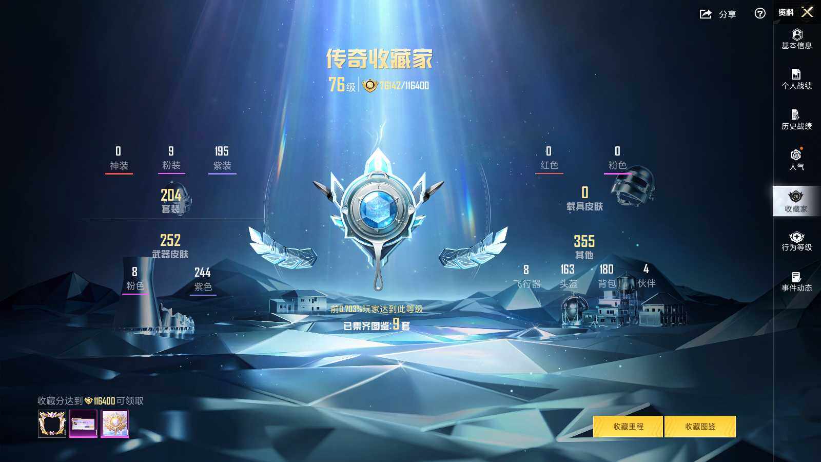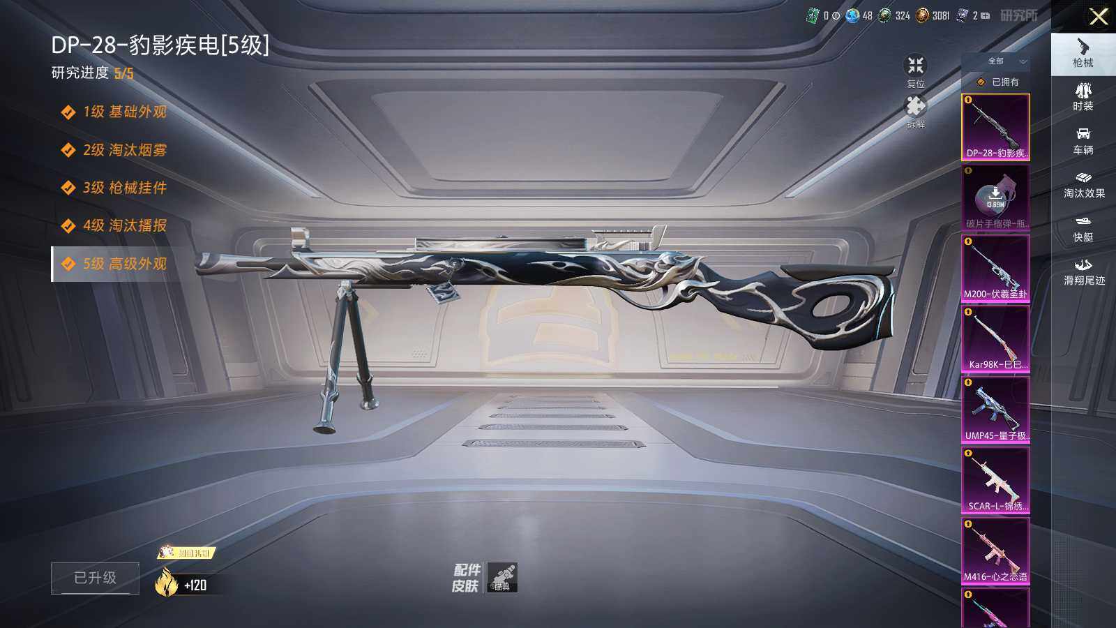 【粉色枪皮等级】:AKM-炫紫旋律(七级),SCAR-L-锦绣绵绵(五级),M416-心之恋语(七级),UMP45-量子极限(五级),Kar98K-巳巳如意(五级),M200-伏羲圣卦(七级),DP-28-豹影疾电(五级),破片手榴弹-瓶中星球(七级)