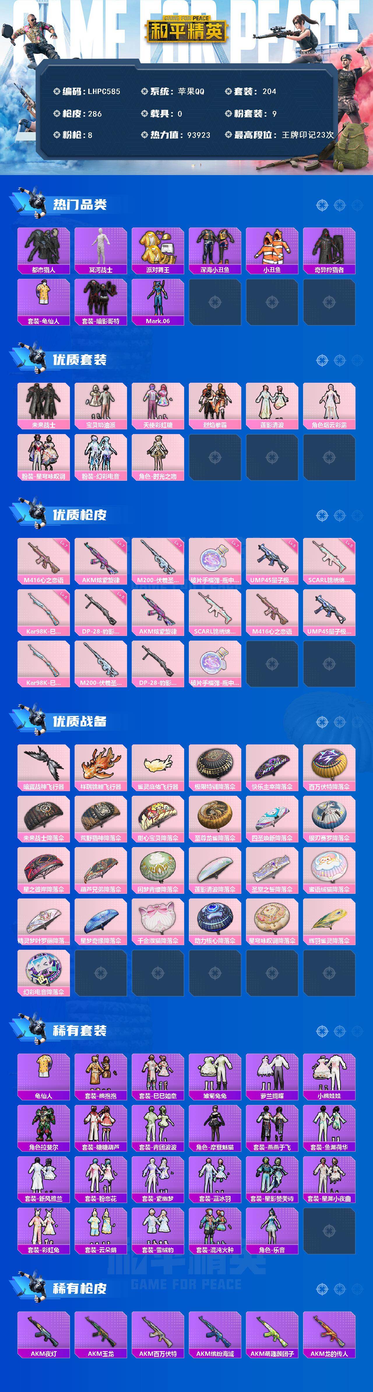 [15930933]可二次【特价出售/店主推荐】苹果 手Q-9粉装-8特效枪-0载具-3粉色飞行器-93923热力值-23王牌印记-204套装-286枪皮 【热门品类】:套装-都市猎人,套装-冥河战士,套装-派对舞王,套装-深海小丑鱼,套装-小丑鱼,套装-奇异狩猎者,套装-龟仙人,套装-暗影哥特,角色-Mark.06 【粉色套装】:粉装-未来战士,粉装-宝贝奶油派,粉装-天使彩虹糖,粉装-烈焰拳霸,粉装-莲影清波,角色-烟云彩露,粉装-星穹咏叹调,粉装-幻彩电音,角色-时光之吻 【粉色枪皮等级】:AKM-炫紫旋律(七级),SCAR-L-锦绣绵绵(五级),M416-心之恋语(七级),UMP45-量子极限(五级),Kar98K-巳巳如意(五级),M200-伏羲圣卦(七级),DP-28-豹影疾电(五级),破片手榴弹-瓶中星球(七级) 【粉色枪皮】:AKM-炫紫旋律,SCAR-L-锦绣绵绵,M416-心之恋语,UMP45-量子极限,Kar98K-巳巳如意,M200-伏羲圣卦,DP-28-豹影疾电,破片手榴弹-瓶中星球 【粉色飞行器】:暗翼战神飞行器,祥瑞锦鲤飞行器,雀灵庇佑飞行器 【粉色降落伞】:极限特训降落伞,快乐主宰降落伞,百万伏特降落伞,未来战士降落伞,荒野猎神降落伞,甜心宝贝降落伞,至尊龙雀降落伞,四圣焕新降落伞,银刃赛罗降落伞,星之彼岸降落伞,葫芦兄弟降落伞,闲梦青缨降落伞,莲影清波降落伞,圣堂之誓降落伞,蜜语绒猫降落伞,精灵梦叶罗丽降落伞,星梦奇缘降落伞,千金淑猫降落伞,动力核心降落伞,星穹咏叹调降落伞,辉羽雀灵降落伞,幻彩电音降落伞 【稀有套装】:套装-龟仙人,套装-熊抱抱,套装-巳巳如意,套装-雏菊兔兔,套装-萝兰蝴蝶,套装-小熊娃娃,角色-拉斐尔,套装-糖糖葫芦,套装-青团波波,角色-摩登魅猫,套装-燕燕于飞,套装-鱼渊荷华,套装-新风雅兰,套装-粉恋花,套装-紫幽梦,套装-蓝冰羽,套装-星影赞美诗,套装-星渊小夜曲,套装-彩虹兔,套装-云朵鹅,套装-雪绒豹,套装-混沌火种,角色-乐音 【稀有枪皮】:AKM-夜灯,AKM-玉龙,AKM-百万伏特,AKM-缤纷海域,AKM-萌趣颜团子,AKM-龙的传人,M16A4-冥河战士,M16A4-夜灯,M16A4-蓝色火焰,SCAR-L-未来战士,SCAR-L-红色方程式,SCAR-L-黄金龙骨,M416-夜灯,M416-梨园星光,M4