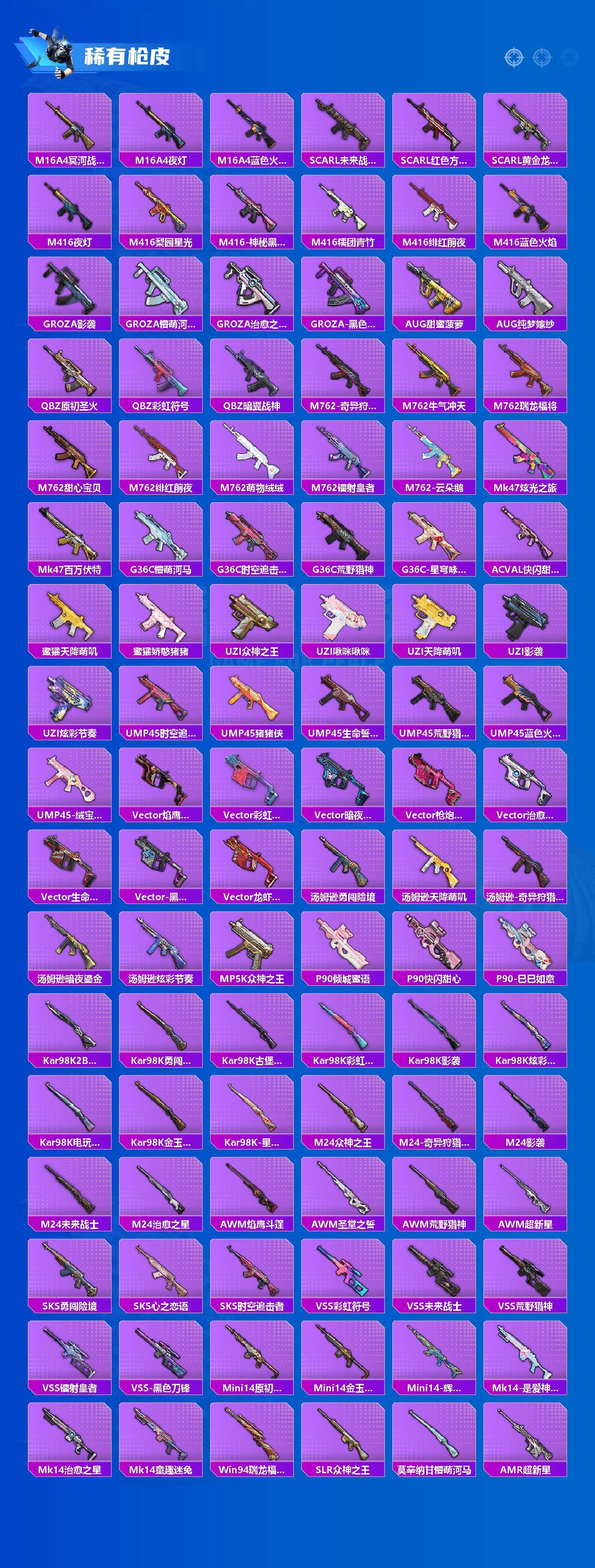 【稀有枪皮】:AKM-夜灯,AKM-玉龙,AKM-百万伏特,AKM-缤纷海域,AKM-萌趣颜团子,AKM-龙的传人,M16A4-冥河战士,M16A4-夜灯,M16A4-蓝色火焰,SCAR-L-未来战士,SCAR-L-红色方程式,SCAR-L-黄金龙骨,M416-夜灯,M416-梨园星光,M4
