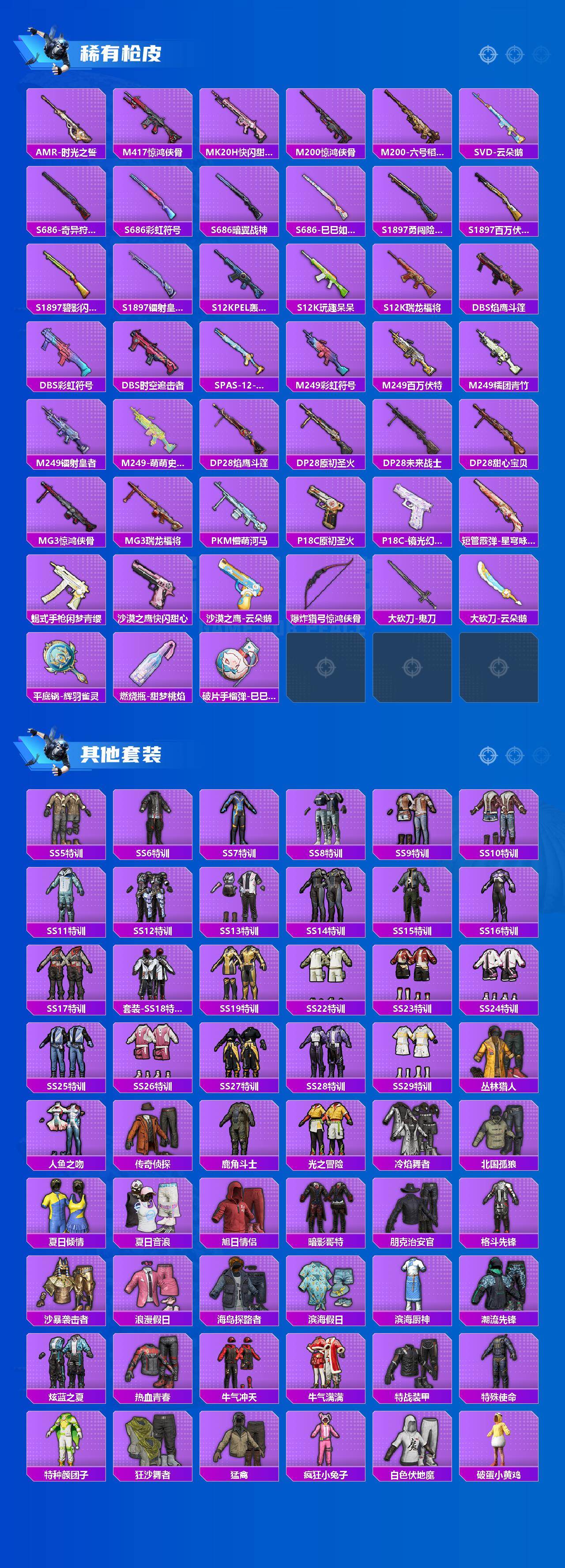AKM-百万伏特,AKM-缤纷海域,M416-梨园星光,M762-奇异狩猎者,M762-瑞龙福将,Kar98K-古堡领主,M24-奇异狩猎者,S686-奇异狩猎者