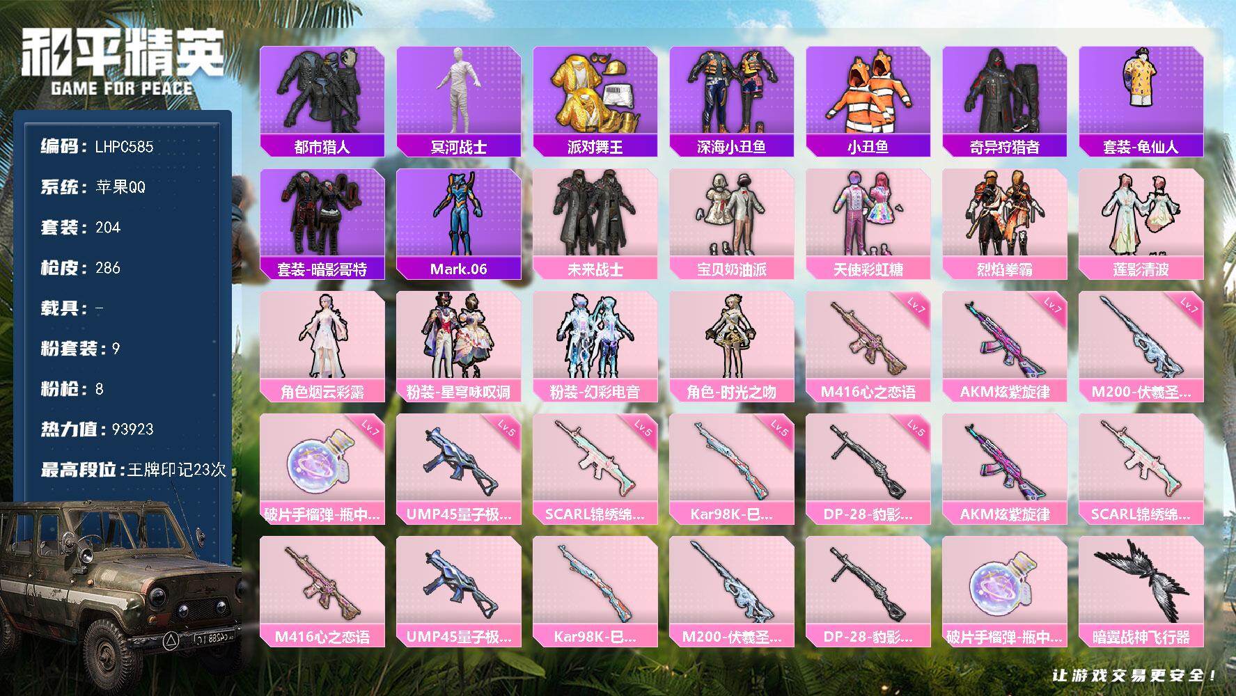 [15930933]可二次【特价出售/店主推荐】苹果 手Q-9粉装-8特效枪-0载具-3粉色飞行器-93923热力值-23王牌印记-204套装-286枪皮