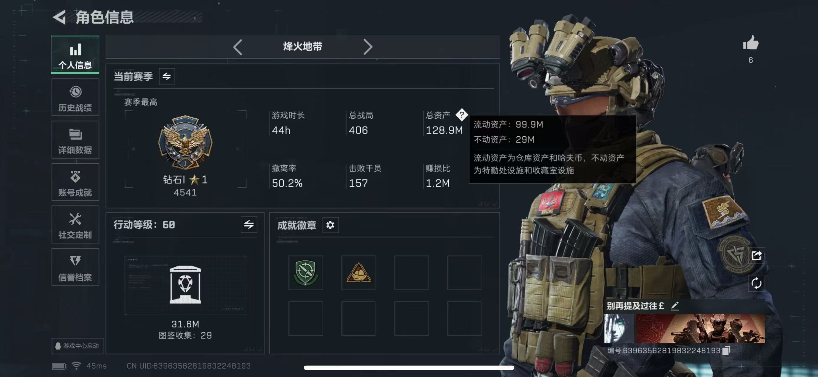 [15942263]【店主推荐捡漏号!可直接换绑】129m总资产-21470k哈伏币-60烽火等级-钻石-1战场等级-无军衔