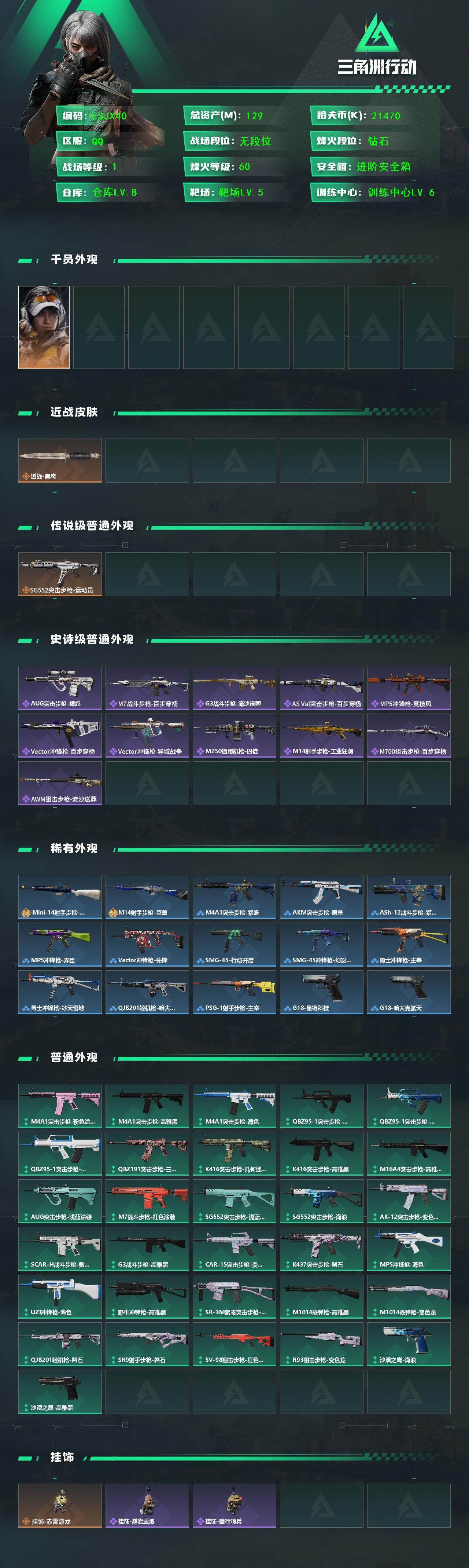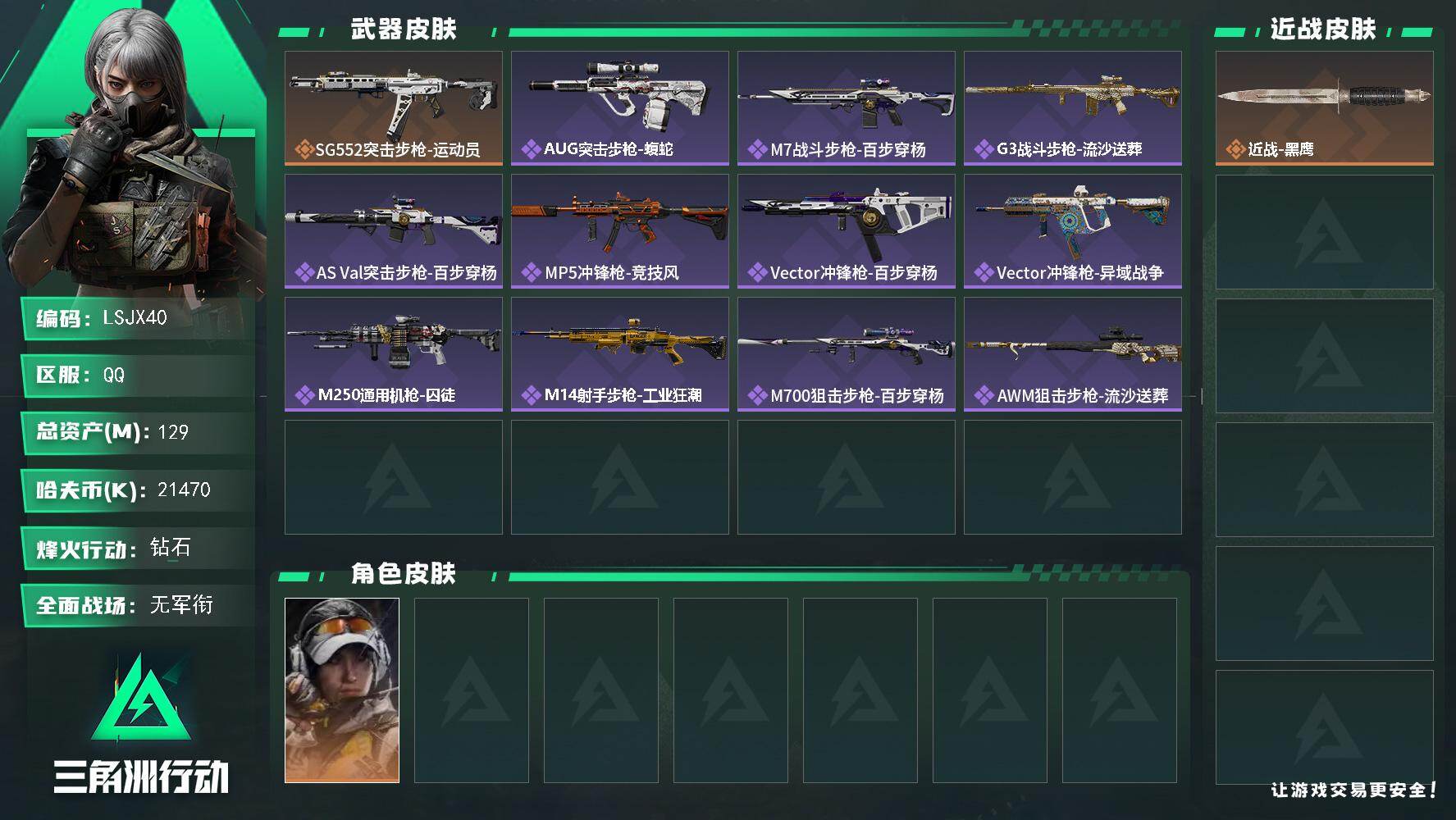 [15942263]【店主推荐捡漏号!可直接换绑】129m总资产-21470k哈伏币-60烽火等级-钻石-1战场等级-无军衔 【干员外观】:露娜-金牌射手 【近战皮肤】:近战-黑鹰 【传说外观】:SG552突击步枪-运动员 【史诗外观】:AUG突击步枪-蝮蛇,M7战斗步枪-百步穿杨,G3战斗步枪-流沙送葬,AS Val突击步枪-百步穿杨,MP5冲锋枪-竞技风,Vector冲锋枪-百步穿杨,Vector冲锋枪-异域战争,M250通用机枪-囚徒,M14射手步枪-工业狂潮,M700狙击步枪-百步穿杨,AWM狙击步枪-流沙送葬 【稀有外观】:Mini-14射手步枪-精湛工艺,M14射手步枪-巨兽,M4A1突击步枪-繁盛,AKM突击步枪-肃杀,ASh-12战斗步枪-繁盛,MP5冲锋枪-弄臣,Vector冲锋枪-先锋,SMG-45-行动开启,SMG-45冲锋枪-幻影结构,勇士冲锋枪-主宰,勇士冲锋枪-冰天雪地,QJB201轻机枪-哈夫克卫队,PSG-1射手步枪-主宰,G18-星链科技,G18-哈夫克航天 【普通外观】:M4A1突击步枪-粉色涂装,M4A1突击步枪-高雅黑,M4A1突击步枪-海色,QBZ95-1突击步枪-高雅黑,QBZ95-1突击步枪-海浪,QBZ95-1突击步枪-海色,QBZ191突击步枪-三角洲力量,K416突击步枪-几何迷彩,K416突击步枪-高雅黑,M16A4突击步枪-高雅黑,AUG突击步枪-浅蓝涂装,M7战斗步枪-红色涂装,SG552突击步枪-浅蓝涂装,SG552突击步枪-海浪,AK-12突击步枪-变色龙,SCAR-H战斗步枪-数码迷彩,G3战斗步枪-高雅黑,CAR-15突击步枪-变色龙,K437突击步枪-磐石,MP5冲锋枪-海色,UZI冲锋枪-海色,野牛冲锋枪-高雅黑,SR-3M紧凑突击步枪-变色龙,M1014霰弹枪-高雅黑,M1014霰弹枪-变色龙,QJB201轻机枪-磐石,SR9射手步枪-磐石,SV-98狙击步枪-红色涂装,R93狙击步枪-变色龙,沙漠之鹰-海浪,沙漠之鹰-高雅黑 【挂饰】:挂饰-赤霄游龙,挂饰-崩岩重炮*2,挂饰-暗行哨兵*2