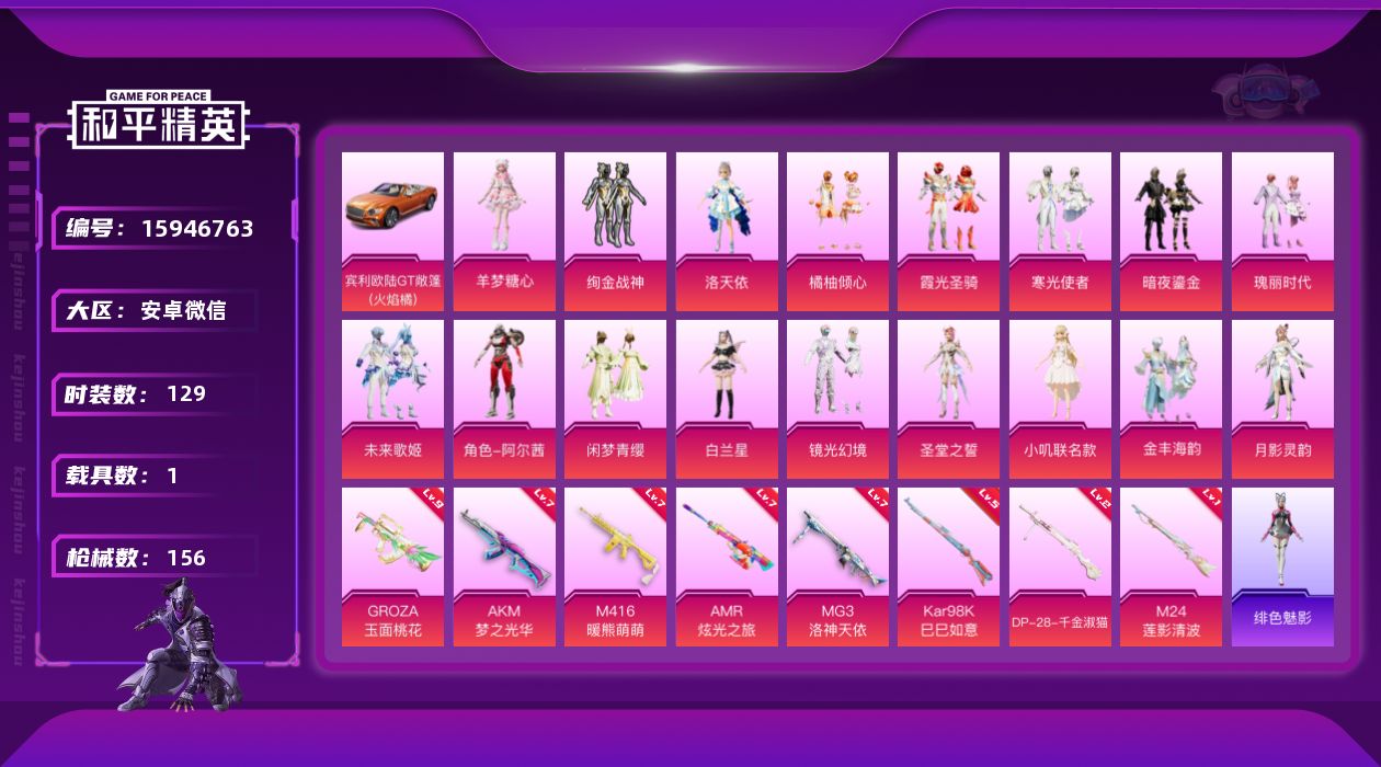 [15946763]【店主推荐捡漏号!可直接换绑】安卓 微信-18粉装-8特效枪-1载具-5粉色飞行器-65316热力值-10王牌印记-129套装-156枪皮【热门品类】:套装-龟仙人【粉色套装】:粉装-绚金战神,角色-洛天依,粉装-橘柚倾心,粉装-霞光圣骑,粉装-寒光使者,粉装-暗夜鎏金,粉装-瑰丽时代,粉装-未来歌姬,角色-阿尔茜,粉装-闲梦青缨,角色-白兰星,粉装-镜光幻境,角色-圣堂之誓,角色-小叽联名款,粉装-金丰海韵,角色-月影灵韵,角色-羊梦糖心【粉色枪皮等级】:AKM-梦之光华(七级),M416-暖熊萌萌(七级),GROZA-玉面桃花(九级),Kar98K-巳巳如意(五级),M24-莲影清波(一级),AMR-炫光之旅(七级),DP-28-千金淑猫(二级),MG3-洛神天依(七级)【粉色载具】:宾利欧陆GT敞篷(火焰橘)【粉色枪皮】:AKM-梦之光华,M416-暖熊萌萌,GROZA-玉面桃花,Kar98K-巳巳如意,M24-莲影清波,AMR-炫光之旅,DP-28-千金淑猫,MG3-洛神天依【粉色飞行器】:歌者泠鸢飞行器,萌物绒绒飞行器,超新星飞行器,镜光幻境飞行翼,沙丘之主天马
