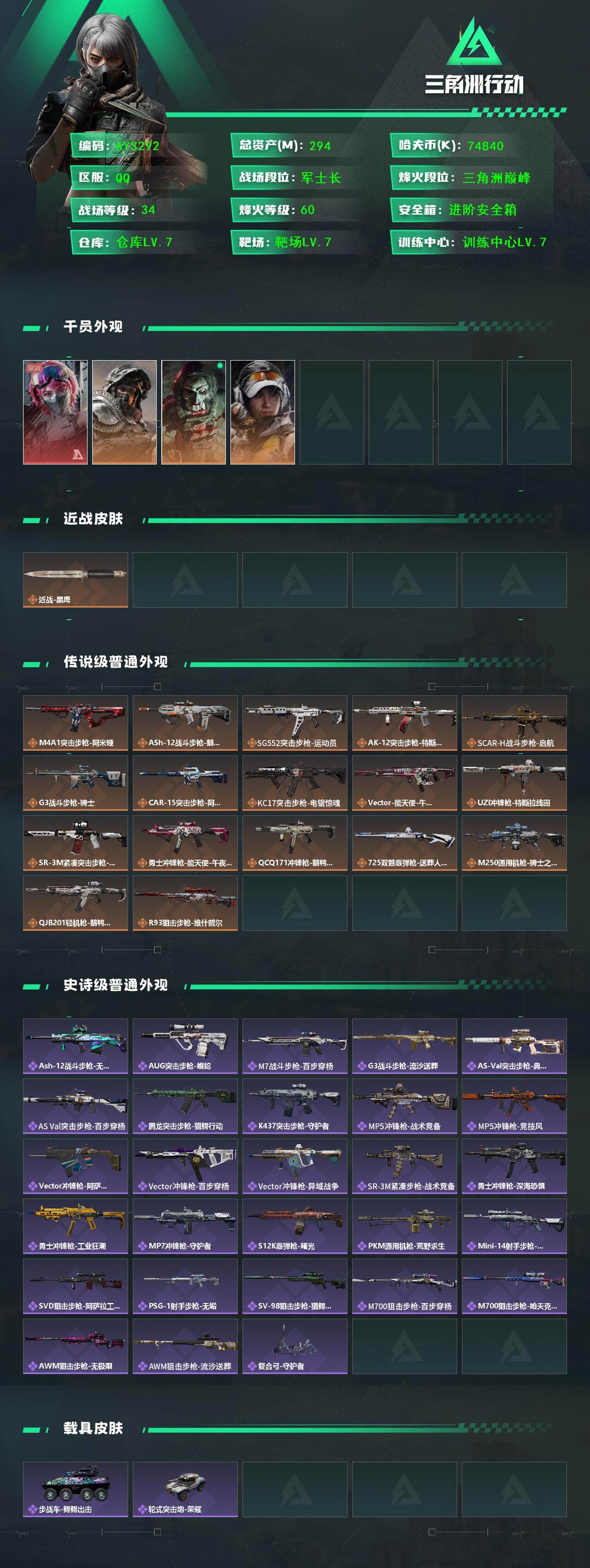 [15970133]可二次【特价出售/店主推荐】294m总资产-74840k哈伏币-60烽火等级-三角洲巅峰-34战场等级-军士长 【干员外观】:蛊-能天使午夜邮差,深蓝-不破誓约,红狼-电锯惊魂,露娜-金牌射手 【近战皮肤】:近战-黑鹰 【传说外观】:M4A1突击步枪-阿米娅,ASh-12战斗步枪-鹅鸭杀,SG552突击步枪-运动员,AK-12突击步枪-特斯拉线圈,SCAR-H战斗步枪-启航,G3战斗步枪-骑士,CAR-15突击步枪-阿米娅,KC17突击步枪-电锯惊魂,Vector冲锋枪-能天使-午夜邮差,UZI冲锋枪-特斯拉线圈,SR-3M紧凑突击步枪-特斯拉线圈,勇士冲锋枪-能天使-午夜邮差,QCQ171冲锋枪-鹅鸭杀,725双管霰弹枪-送葬人-无题密令,M250通用机枪-骑士之心,QJB201轻机枪-鹅鸭杀,R93狙击步枪-维什戴尔 【史诗外观】:ASh-12战斗步枪-无极限,AUG突击步枪-蝮蛇,M7战斗步枪-百步穿杨,G3战斗步枪-流沙送葬,AS Val突击步枪-典狱官,AS Val突击步枪-百步穿杨,腾龙突击步枪-猎鳄行动,K437突击步枪-守护者,MP5冲锋枪-战术竞备,MP5冲锋枪-竞技风,Vector冲锋枪-阿萨拉文明,Vector冲锋枪-百步穿杨,Vector冲锋枪-异域战争,SR-3M紧凑突击步枪-战术竞备,勇士冲锋枪-深海恐惧,勇士冲锋枪-工业狂潮,MP7冲锋枪-守护者,S12K霰弹枪-曙光,PKM通用机枪-荒野求生,Mini-14射手步枪-守护者,SVD狙击步枪-阿萨拉工艺,PSG-1射手步枪-无垢,SV-98狙击步枪-猎鳄行动,M700狙击步枪-百步穿杨,M700狙击步枪-哈夫克警备,AWM狙击步枪-无极限,AWM狙击步枪-流沙送葬,复合弓-守护者 【稀有外观】:G18-银灰金属,M7战斗步枪-天际线,M870霰弹枪-地平线,SCAR-H战斗步枪-旧梦,SG552突击步枪-巨兽,M14射手步枪-巨兽,M4A1突击步枪-繁盛,AKM突击步枪-战术演练,AKM突击步枪-肃杀,QBZ95-1突击步枪-公平竞技,ASh-12战斗步枪-繁盛,M7战斗步枪-捣蛋鬼,AK-12突击步枪-前沿科技,SCAR-H战斗步枪-荣耀列队,SCAR-H战斗步枪-黄昏,G3战斗步枪-战术演练,G3战斗步枪-主宰,腾龙突击步枪-前沿科技,腾龙突击步枪-冰天雪地,K437突击步枪-天狼