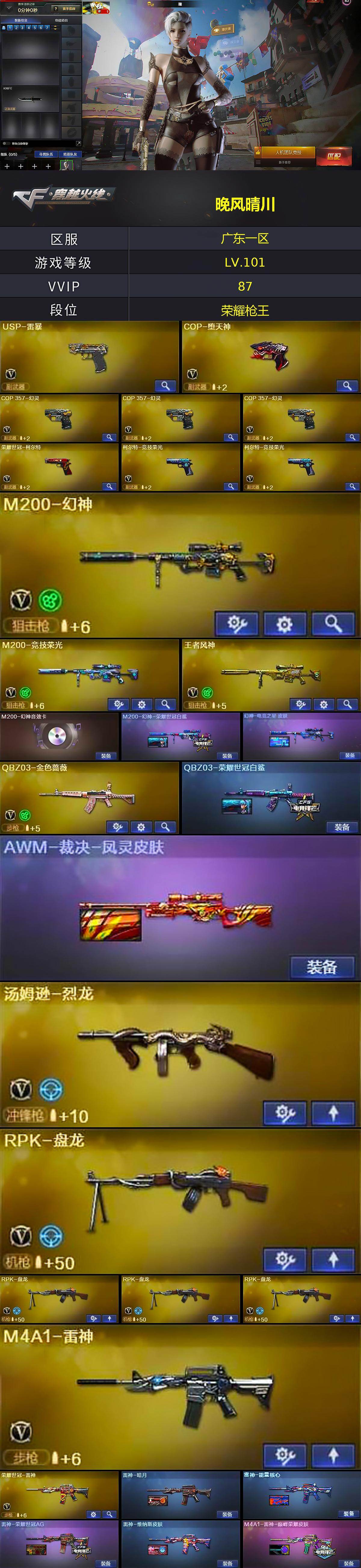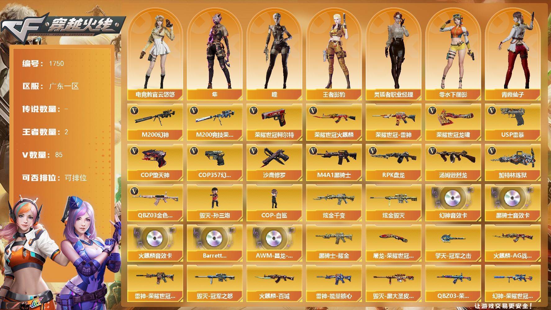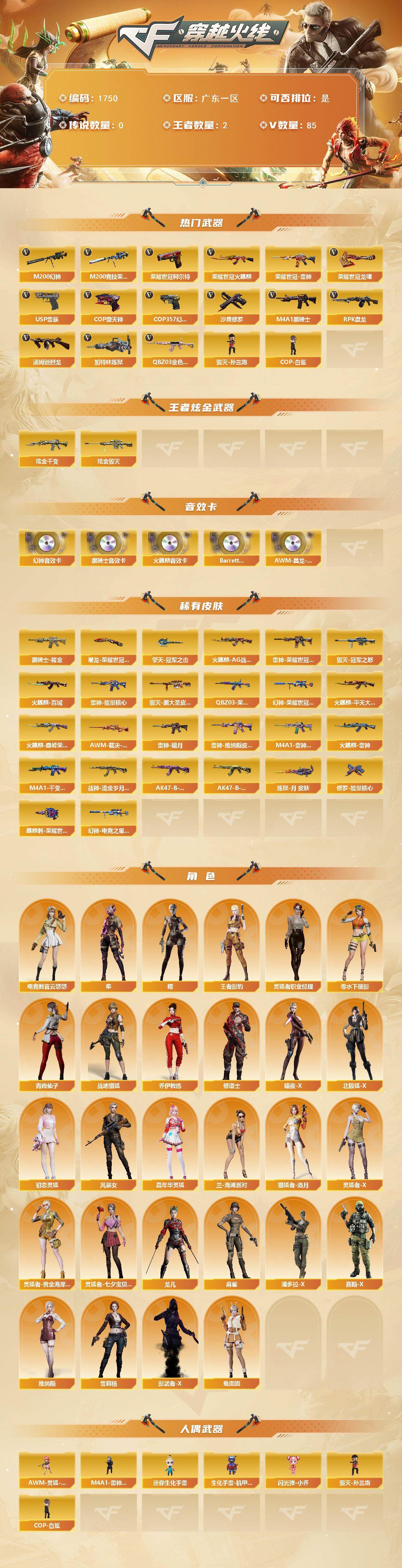 [15978073]广东一区-85V-2王者-2炫金 【热门武器】:QBZ03-金色蔷薇,M200-幻神,M200-竞技荣光,荣耀世冠-火麒麟,荣耀世冠-雷神,荣耀世冠-柯尔特,M4A1-黑骑士,汤姆逊-烈龙,RPK-盘龙*4,加特林-炼狱*2,毁灭-孙三炮,COP-白鲨,USP-雷暴,COP-堕天神,COP 357-幻灵*3,沙鹰-修罗,荣耀世冠-龙啸 【王者炫金武器】:炫金千变,炫金毁灭 【音效卡】:M200-幻神音效卡,AK47-火麒麟音效卡,M4A1-黑骑士音效卡,Barrett-碧霄极光音效卡,AWM-昌龙-怀旧音效卡 【皮肤】:M200-幻神-荣耀世冠白鲨,幻神-电竞之星 皮肤,QBZ03-荣耀世冠白鲨,AWM-裁决-凤灵皮肤,雷神-暗月,雷神-能量核心,雷神-荣耀世冠AG,雷神-维纳斯皮肤,M4A1-雷神-巅峰荣耀皮肤,火麒麟-AG战队皮肤,火麒麟-雷神,火麒麟-平天大圣,火麒麟-百城,火麒麟-巅峰荣耀,毁灭-冠军之怒,毁灭-黑大圣皮肤,M4A1-千变-孔明皮肤,黑骑士耀金皮肤,战神-流金岁月皮肤,AK47-B-常胜将军-曹操,AK47-B-常胜将军-孙权,炼狱-月 皮肤,修罗-能量核心,屠龙-荣耀世冠AG,擎天-冠军之击,麒麟刺-荣耀世冠白鲨 【角色】:瞳,电竞教官-云悠悠,隼,战地猎狐,王者影豹,乔伊教练,修道士,暗夜-X,北极狐-X,初恋灵狐,风暴女,嘉年华灵狐,兰-海滩派对,猎狐者-追月,零-水下丽影,灵狐者-X,灵狐者-黄金海岸,灵狐者-七夕宝贝,灵狐者-职业经理,龙儿,麻雀,潘多拉-X,青霞仙子,赛斯-X,兔囡囡,维纳斯,雪莉杨,影武者-X 【人偶武器】:COP-白鲨,毁灭-孙三炮,M4A1-雷神-精英刀锋,AWM-灵狐-15周年嘉年华,迷你生化手雷,生化手雷-机甲核心*2,闪光弹-小乔 【暴走生化】:超级对讲机 【挑战大师】:冰龙粉碎者-白马银枪,激光毁灭者III-白马银枪,激光毁灭者III*9,神圣爆裂者-末日III*2,阐释者III 【英雄级武器】:AK47-火麒麟,M4A1-雷神,M4A1-黑骑士,AK47-无影,AK12-天启,AK47-黑鲨,M4A1-幻灵,M4A1-玫瑰精灵,QBZ03-金色蔷薇,烈火-动感闪耀,AK-47-猩红传说,AK47-B-战神,AK47-B-常胜将军,荣耀世冠-火麒麟,荣耀世冠-雷神,Barrett-毁灭*2,M200