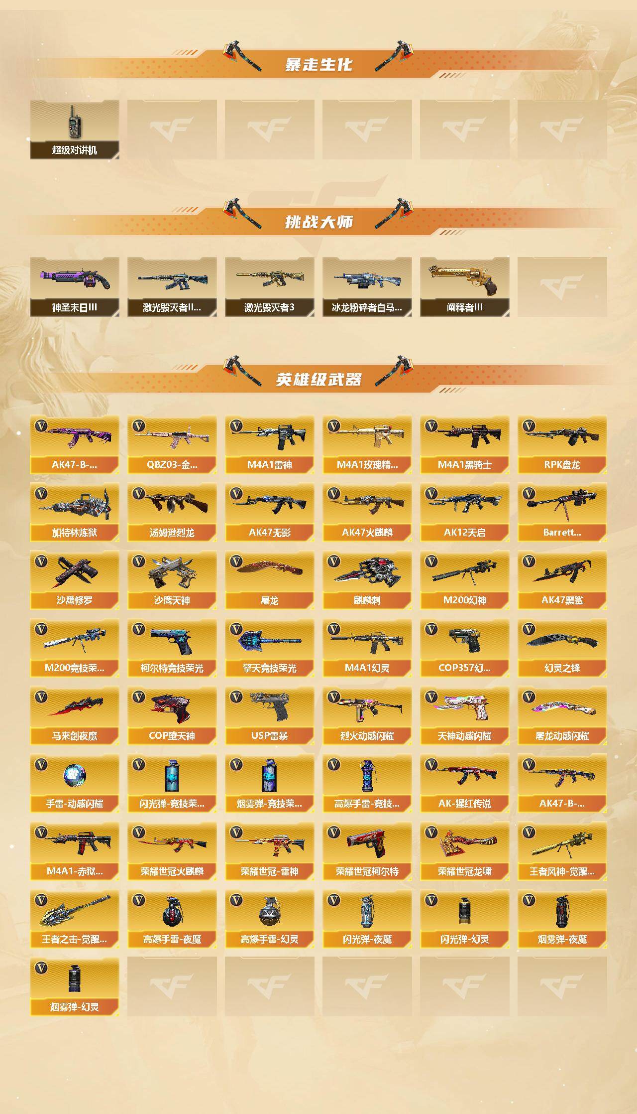 【英雄级武器】:AK47-火麒麟,M4A1-雷神,M4A1-黑骑士,AK47-无影,AK12-天启,AK47-黑鲨,M4A1-幻灵,M4A1-玫瑰精灵,QBZ03-金色蔷薇,烈火-动感闪耀,AK-47-猩红传说,AK47-B-战神,AK47-B-常胜将军,荣耀世冠-火麒麟,荣耀世冠-雷神,Barrett-毁灭*2,M200