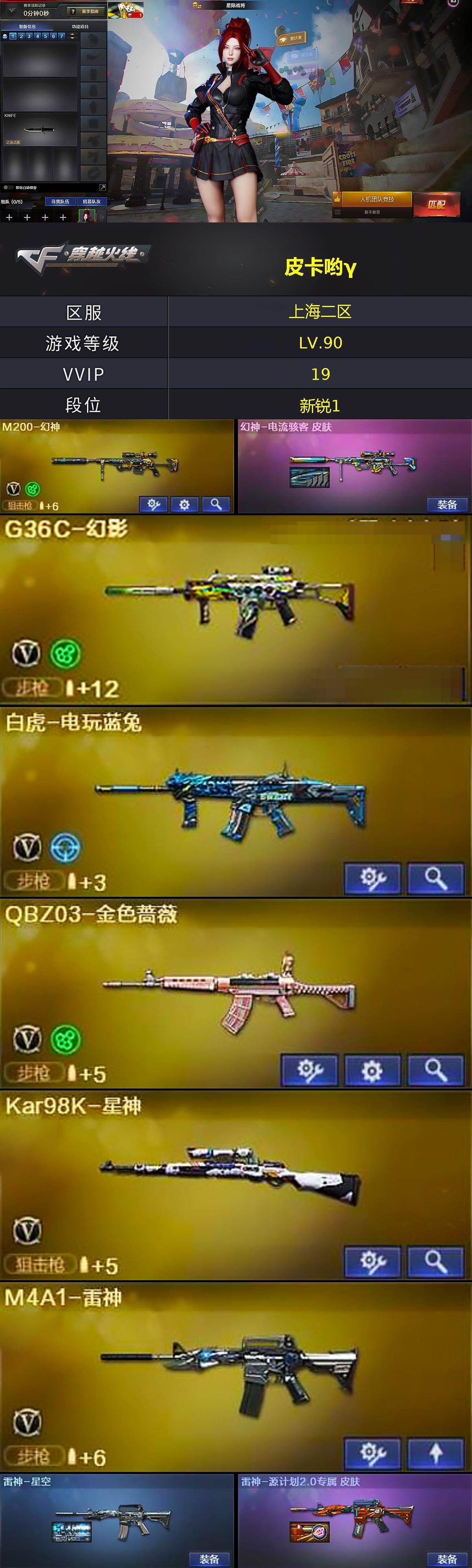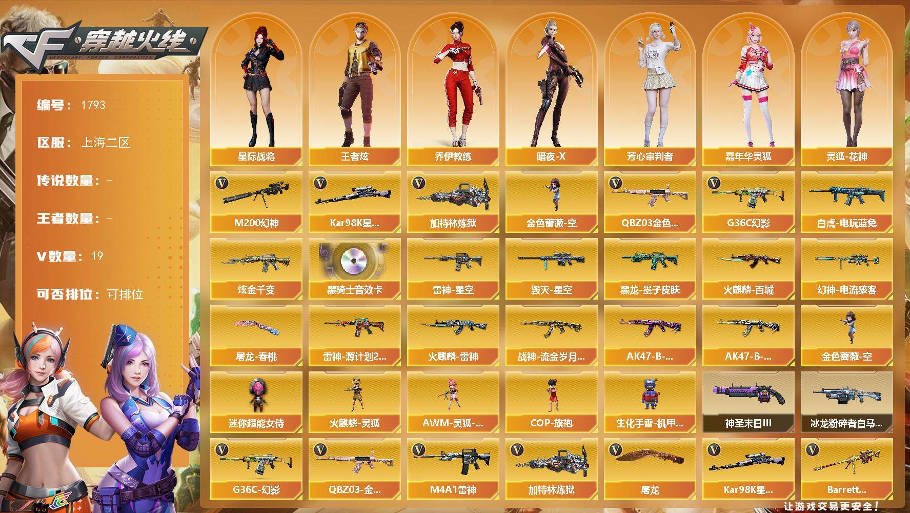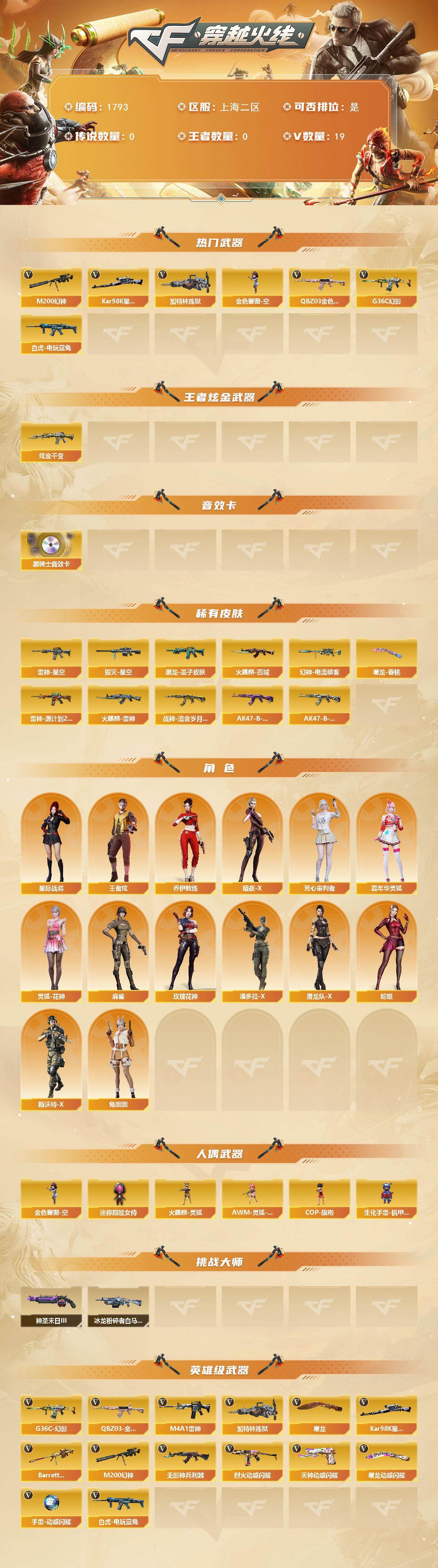 [16020863]上海二区-19V-0王者-1炫金 【热门武器】:G36C-幻影,QBZ03-金色蔷薇,M200-幻神,白虎-电玩蓝兔,Kar98K-星神,加特林-炼狱,金色蔷薇-空 【王者炫金武器】:炫金千变 【音效卡】:M4A1-黑骑士音效卡 【皮肤】:幻神-电流骇客 皮肤,雷神-星空,雷神-源计划2.0专属 皮肤,火麒麟-雷神,火麒麟-百城,毁灭-星空,黑龙-墨子皮肤,战神-流金岁月皮肤*2,AK47-B-常胜将军-曹操,AK47-B-常胜将军-刘备,屠龙-春桃 皮肤 【角色】:星际战将,王者炫,乔伊教练,暗夜-X,芳心审判者,嘉年华灵狐,灵狐-花神,麻雀,玫瑰花神,潘多拉-X,潜龙队-X,蛇姬,斯沃特-X,兔囡囡 【人偶武器】:火麒麟-灵狐,金色蔷薇-空,AWM-灵狐-15周年嘉年华,COP-旗袍,生化手雷-机甲核心,迷你超能女侍 【挑战大师】:冰龙粉碎者-白马银枪,神圣爆裂者-末日III*2 【英雄级武器】:M4A1-雷神,无影-神兵利器,G36C-幻影,QBZ03-金色蔷薇,烈火-动感闪耀,白虎-电玩蓝兔,M200-幻神,Barrett-朱雀,Kar98K-星神,加特林-炼狱,天神-动感闪耀,屠龙,屠龙-动感闪耀,手雷-动感闪耀 【道具】:CFS限定背包,亚洲杯纪念炫彩背包,绿色巨人,灵魂忍者,迷雾幽灵,夺命之镰,防化服*2,金色流光-枪王排位*2,枪王排位29赛季金色流光,语音特效-机器人,电玩兔兔表情,动感闪耀表情,C4-沙漠,防弹头盔*2,防弹衣*2,C4工具钳*2,手雷包*2 【特殊枪械】:1炼狱