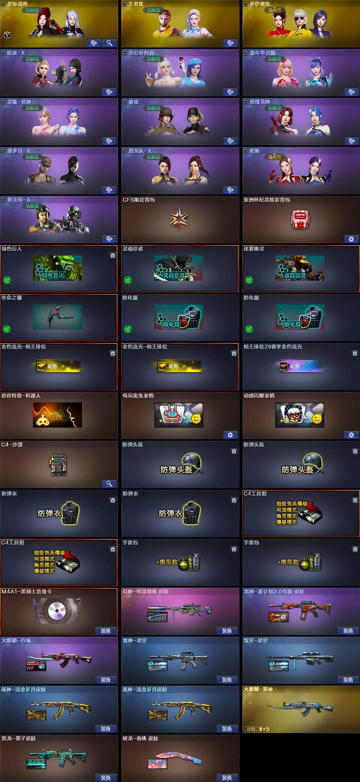 【道具】:CFS限定背包,亚洲杯纪念炫彩背包,绿色巨人,灵魂忍者,迷雾幽灵,夺命之镰,防化服*2,金色流光-枪王排位*2,枪王排位29赛季金色流光,语音特效-机器人,电玩兔兔表情,动感闪耀表情,C4-沙漠,防弹头盔*2,防弹衣*2,C4工具钳*2,手雷包*2
