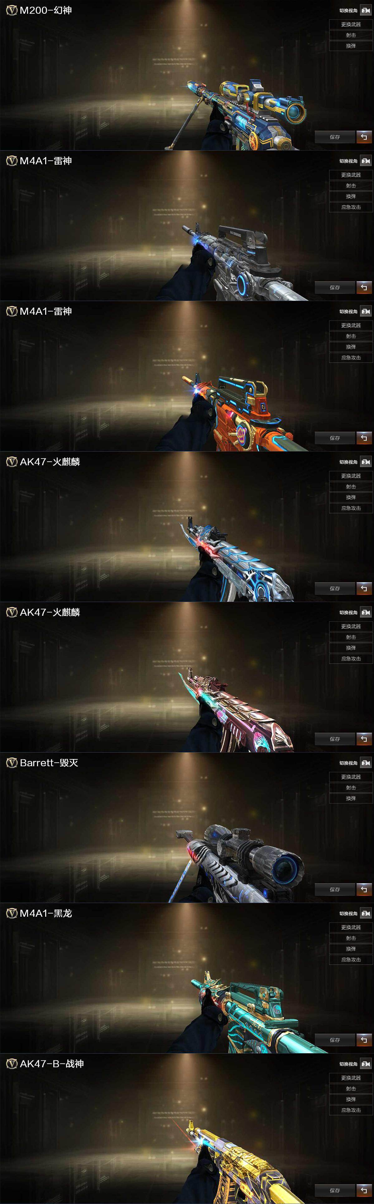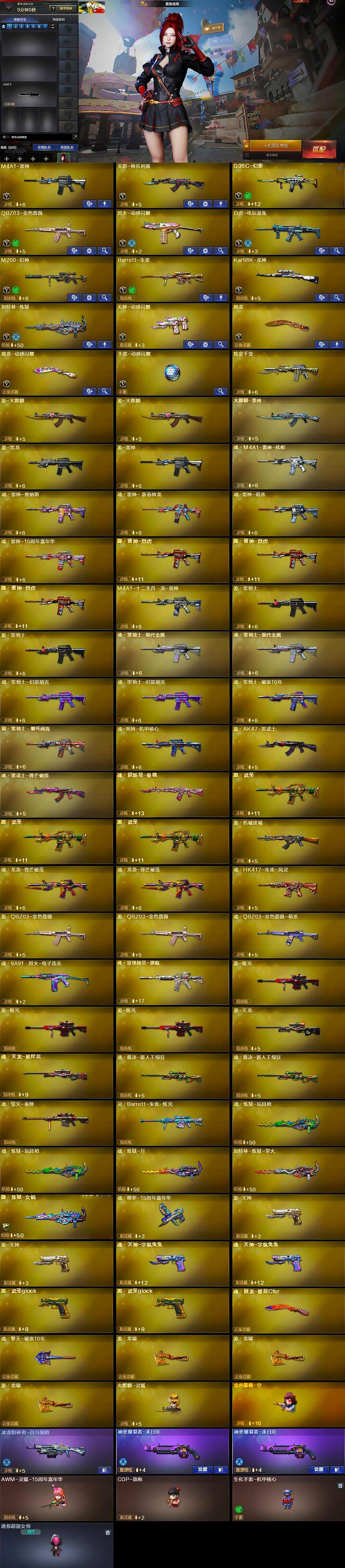 【英雄级武器】:M4A1-雷神,无影-神兵利器,G36C-幻影,QBZ03-金色蔷薇,烈火-动感闪耀,白虎-电玩蓝兔,M200-幻神,Barrett-朱雀,Kar98K-星神,加特林-炼狱,天神-动感闪耀,屠龙,屠龙-动感闪耀,手雷-动感闪耀