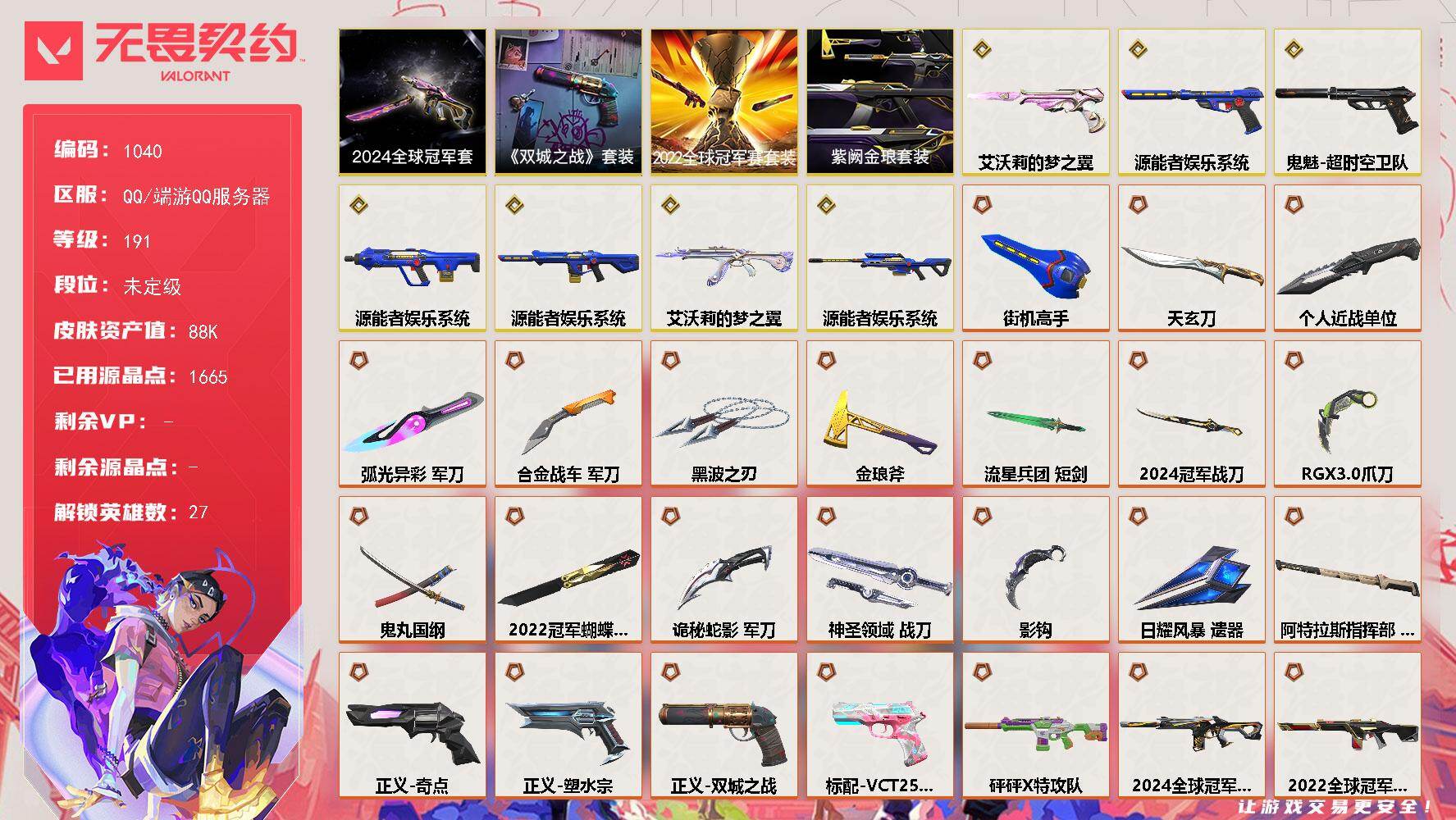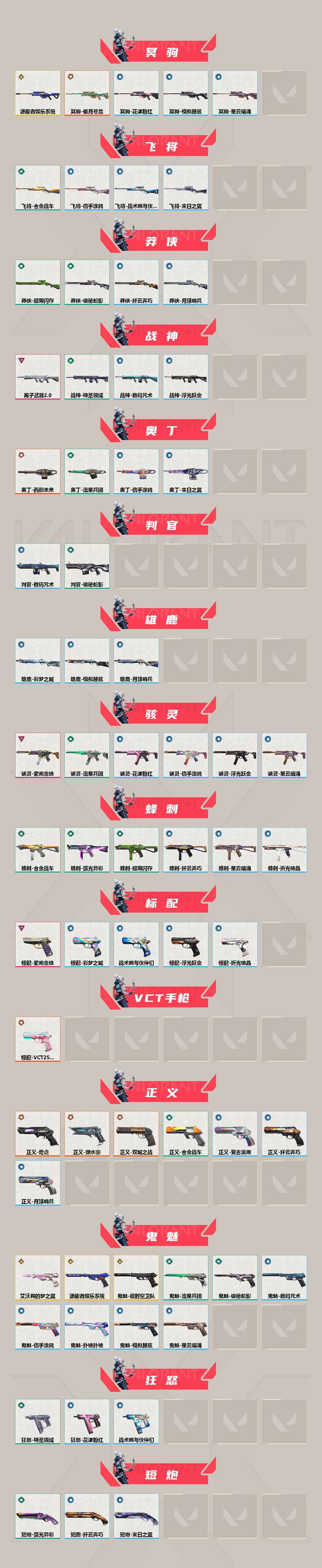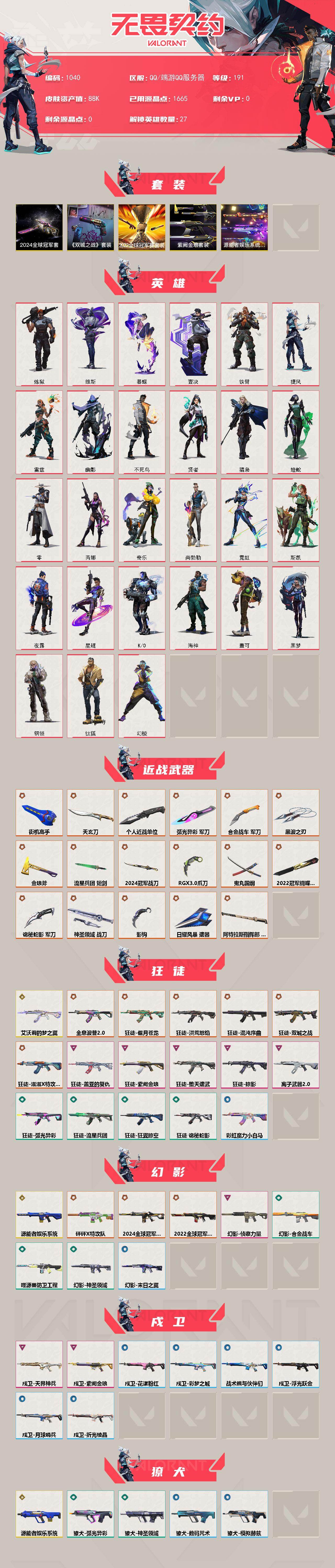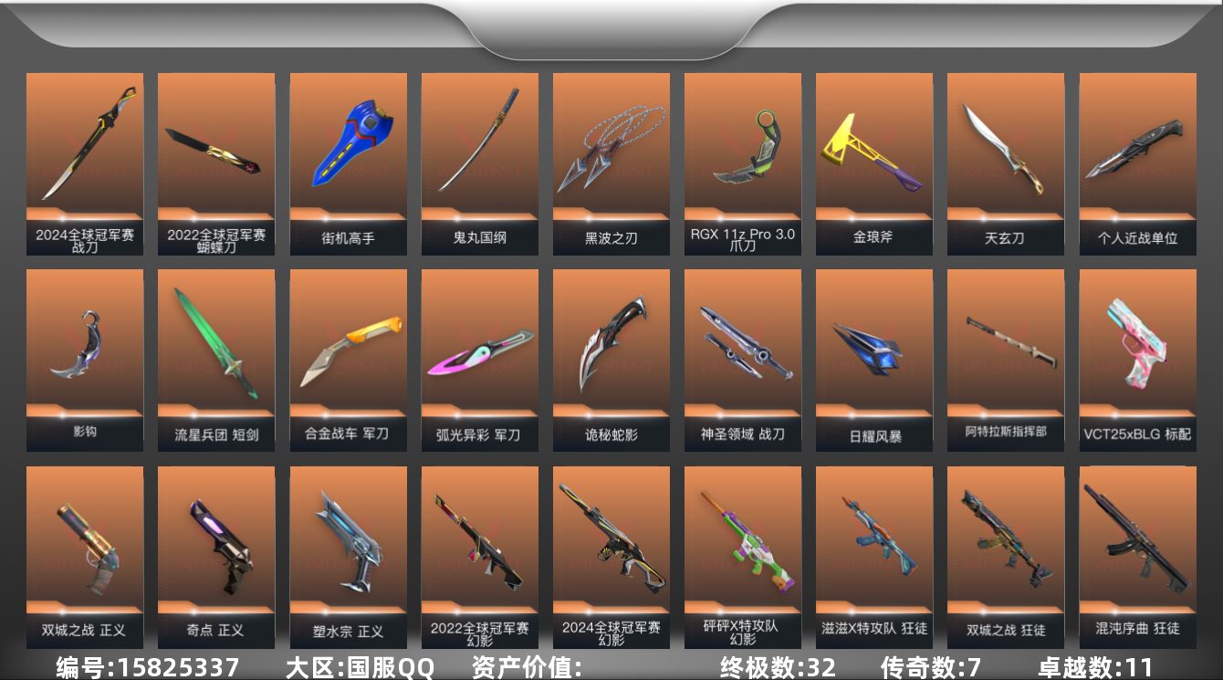 [15825337]【套装】:2024全球冠军赛套装,2022全球冠军赛套装,源能者娱乐系统套装,《英雄联盟:双城之战》套装,紫阙金琅套装 【英雄】:幻棱,炼狱,维斯,暮蝶,钛狐,壹决,铁臂,捷风,雷兹,幽影,不死鸟,贤者,猎枭,蝰蛇,零,芮娜,奇乐,尚勃勒,霓虹,斯凯,夜露,星礈,K/O,海神,盖可,黑梦,钢锁 【近战武器】:近战武器-2024全球冠军赛 战刀,近战武器-2022全球冠军赛 蝴蝶刀,近战武器-影钩,近战武器-RGX 11z Pro//3.0 爪刀,近战武器-黑波之刃,近战武器-鬼丸国纲,近战武器-流星兵团 短剑,近战武器-个人近战单位,近战武器-合金战车 军刀,近战武器-弧光异彩 军刀,近战武器-街机高手,近战武器-金琅斧,近战武器-天玄刀,近战武器-诡秘蛇影 军刀,近战武器-神圣领域 战刀,近战武器-日耀风暴 遗器,近战武器-阿特拉斯指挥部 甩棍 【狂徒】:狂徒-艾沃莉的梦之翼,狂徒-洪荒怒焰,狂徒-混沌序曲,狂徒-全息波普//2.0,狂徒-双城之战,狂徒-偃月苍龙,狂徒-滋滋X特攻队,狂徒-堕天遗武,狂徒-掠影,狂徒-盖亚的复仇,狂徒-紫阙金琅,狂徒-离子武器//2.0,狂徒-弧光异彩,狂徒-狂翼掠空,狂徒-流星兵团,狂徒-诡秘蛇影,狂徒-彩虹魔力小白马 【幻影】:幻影-源能者娱乐系统,幻影-2022全球冠军赛,幻影-2024全球冠军赛,幻影-砰砰X特攻队,幻影-侦察力量,幻影-合金战车,幻影-噬源兽防卫工程,幻影-神圣领域,幻影-末日之翼 【戍卫】:戍卫-天界神兵,戍卫-紫阙金琅,戍卫-彩梦之城,戍卫-浮光跃金,戍卫-花漾粉红,戍卫-战术熊与伙伴们,戍卫-月球哨兵,戍卫-折光棱晶 【獠犬】:獠犬-源能者娱乐系统,獠犬-弧光异彩,獠犬-神圣领域,獠犬-模拟赫兹,獠犬-数码咒术 【冥驹】:冥驹-源能者娱乐系统,冥驹-偃月苍龙,冥驹-花漾粉红,冥驹-模拟赫兹,冥驹-星云暗涌 【飞将】:飞将-合金战车,飞将-信手涂鸦,飞将-战术熊与伙伴们,飞将-末日之翼 【莽侠】:莽侠-超限闪存,莽侠-诡秘蛇影,莽侠-纤云弄巧,莽侠-月球哨兵 【战神】:战神-离子武器//2.0,战神-神圣领域,战神-浮光跃金,战神-数码咒术 【奥丁】:奥丁-西部未来,奥丁-流星兵团,奥丁-信手涂鸦,奥丁-末日之翼 【判官】:判官-诡秘蛇影,判官-数码咒术 【雄鹿】:雄鹿-彩梦之城,雄鹿-模拟赫兹,雄