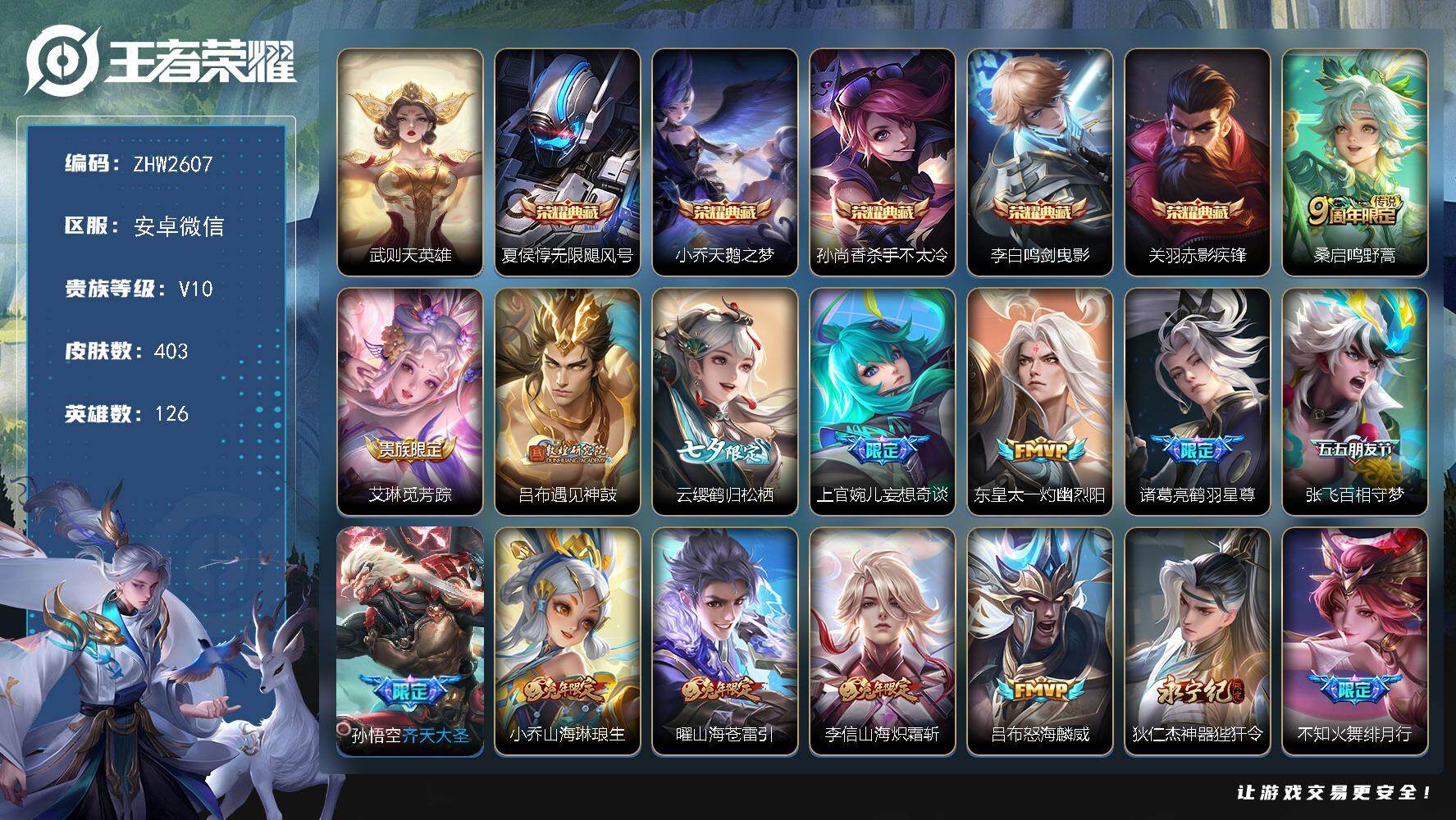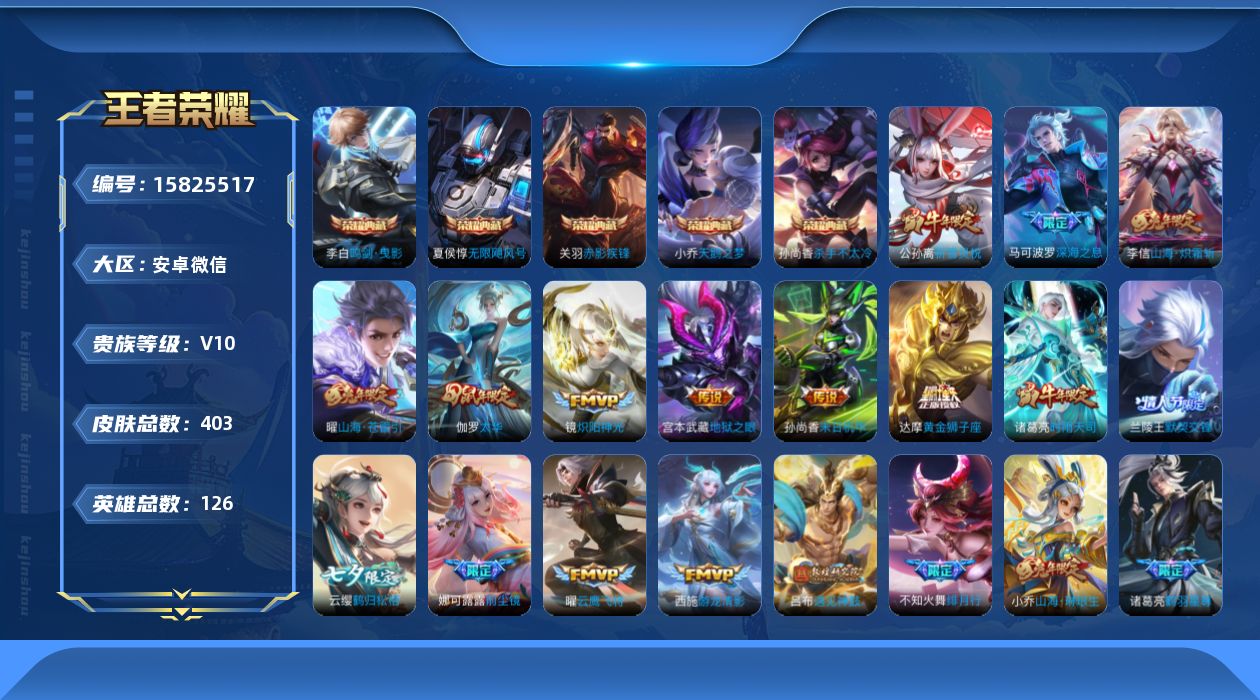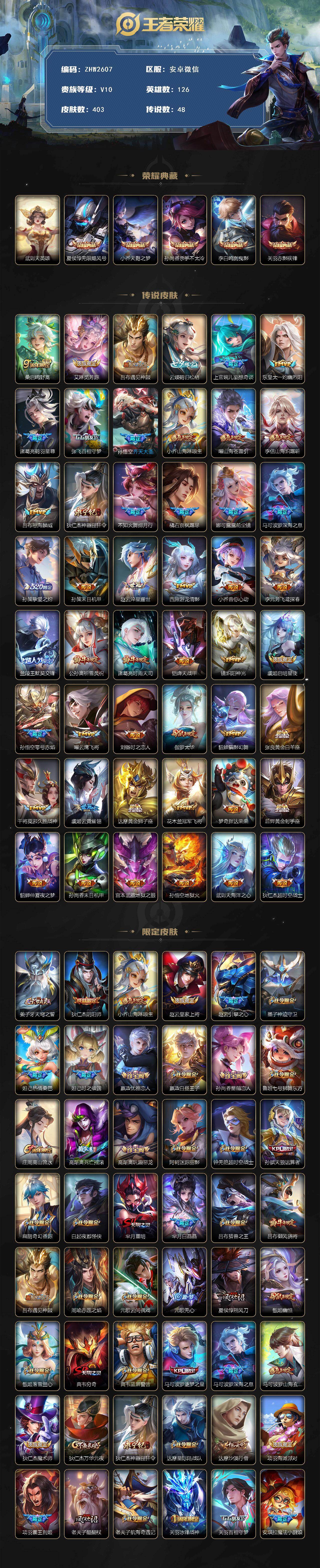 [15825517]安卓WX-V10-尊贵铂金IV段位-126英雄-403皮肤-5典藏皮肤-1典藏英雄-48传说-126史诗