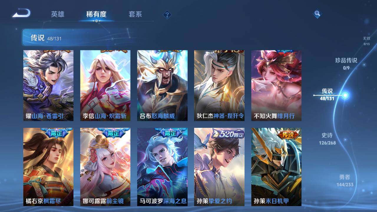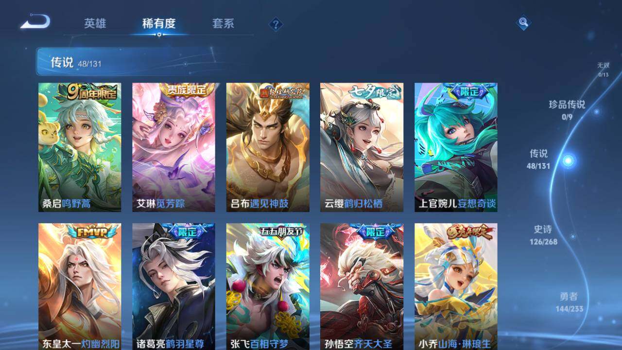 【传说皮肤】:桑启鸣野蒿,艾琳觅芳踪,吕布遇见神鼓,云缨鹤归松栖,上官婉儿妄想奇谈,东皇太一灼幽烈阳,诸葛亮鹤羽星尊,张飞百相守梦,孙悟空齐天大圣,小乔山海琳琅生,曜山海苍雷引,李信山海炽霜斩,吕布怒海麟威,狄仁杰神器狴犴令,不知火舞绯月行,橘右京枫霜尽,娜可露露前尘镜,马可波罗深海之息,孙策挚爱之约,孙策末日机甲,赵云淬星耀世,西施游龙清影,小乔音你心动,李元芳飞鸢探春,兰陵王默契交锋,公孙离祈雪灵祝,诸葛亮时雨天司,铠绛天战甲,镜炽阳神光,虞姬启明星使,孙悟空零号赤焰,曜云鹰飞将,刘备时之恋人,伽罗太华,貂蝉猫影幻舞,张良黄金白羊座,干将莫邪久胜战神,虞姬云霓雀翎,达摩黄金狮子座,花木兰冠军飞将,梦奇胖达荣荣,后羿黄金射手座,貂蝉仲夏夜之梦,孙尚香末日机甲,宫本武藏地狱之眼,孙悟空地狱火,武则天海洋之心,狄仁杰超时空战士