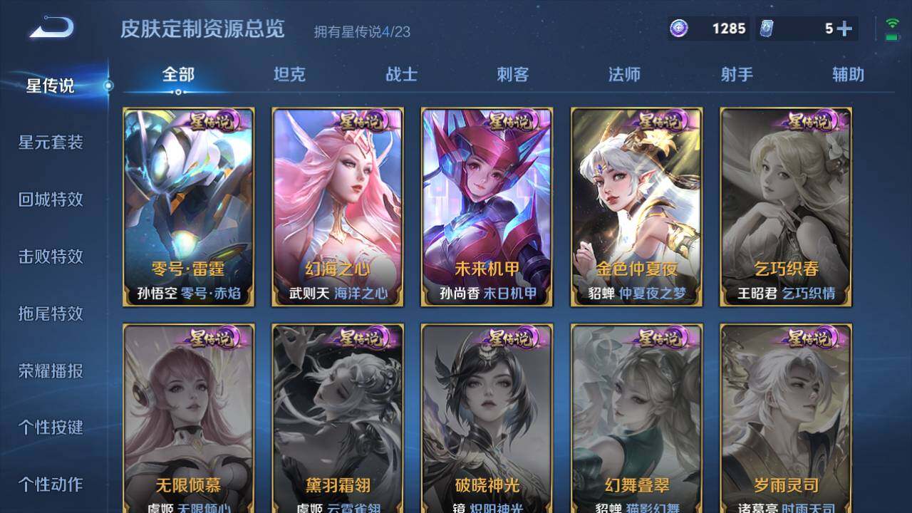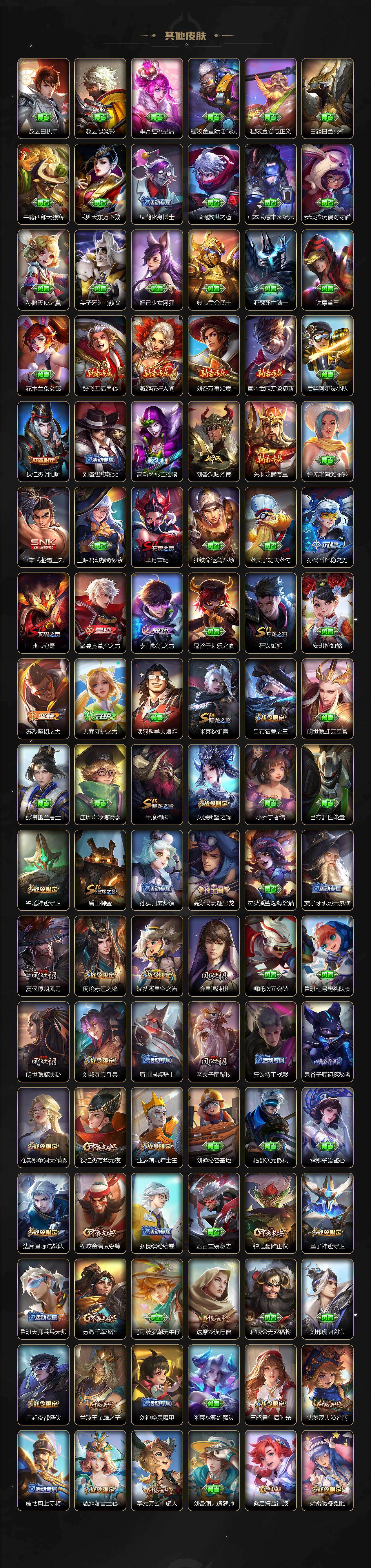 芈月重明,典韦穷奇,狂铁御狮,米莱狄御霄,牛魔御旌,盾山御銮,夏侯惇朔风刀,明世隐疑决卦,老夫子醍醐杖,鬼谷子原初探秘者,狄仁杰万华元夜,程咬金演武夺筹,钟馗驱傩正仪,苏烈千军破阵,吕布猎兽之王,嬴政白昼王子,女娲朔望之晖,典韦蓝屏警告,钟馗神迹守卫,鲁班七号狮舞东方,沈梦溪星空之诺,李元芳银河之约,刘邦夺宝奇兵,蒙犽狂想玩偶喵,元歌云间偶戏,弈星混沌棋,达摩沙漠行僧,兰陵王金庭之子,沈梦溪大漠名商,李元芳云中旅人,桑启海盐诗旅,裴擒虎擒涛扼浪,鲁班大师探海日志,张良古海寻踪
