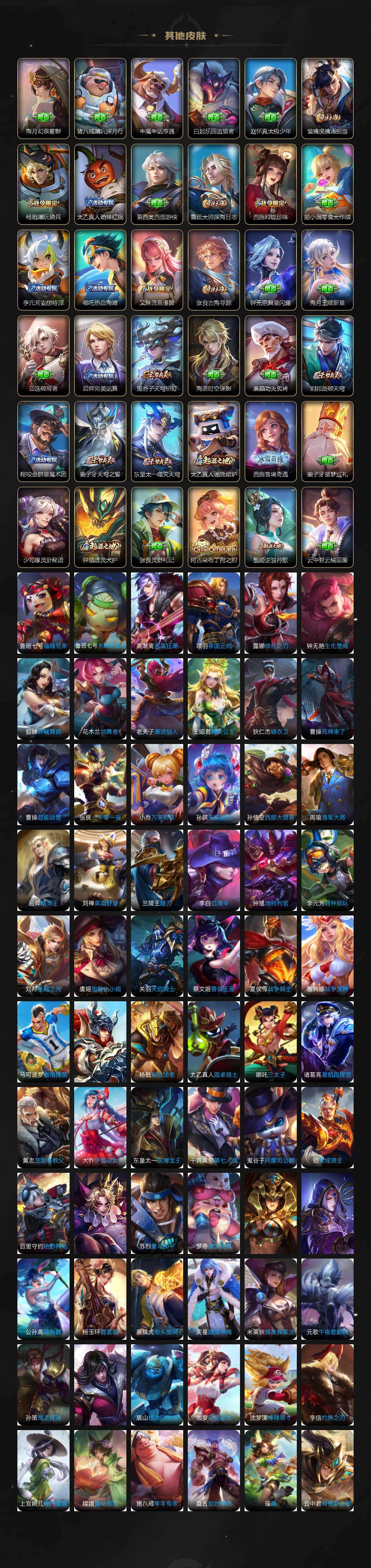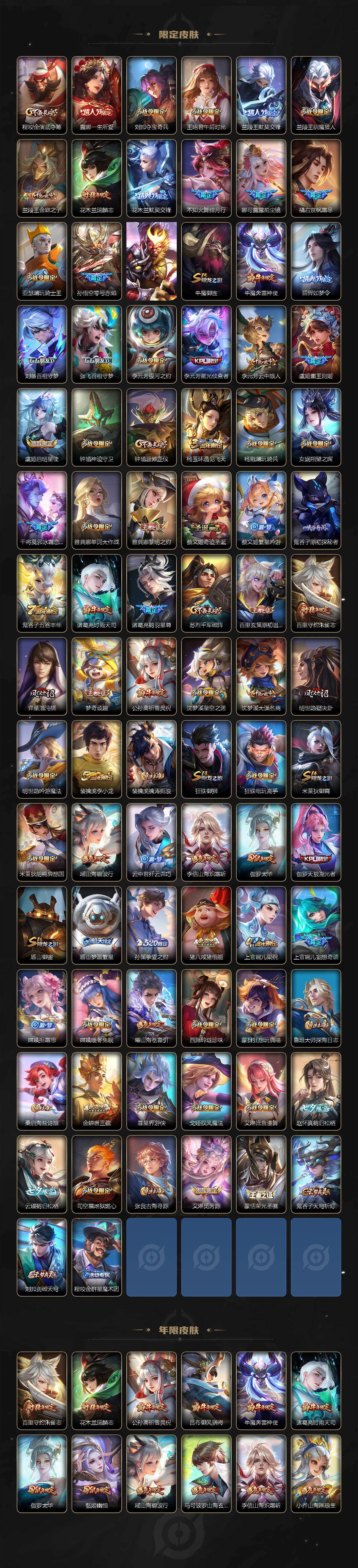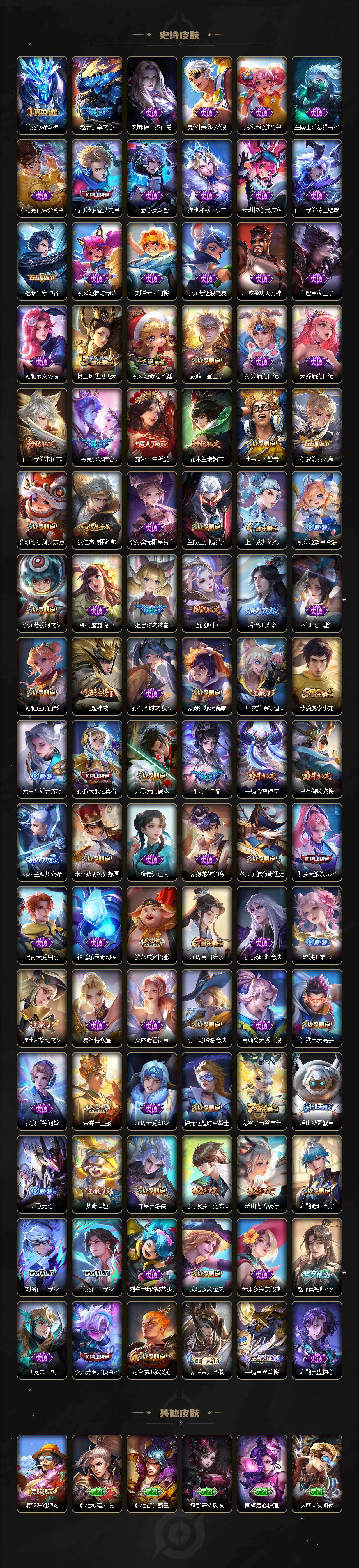 【限定皮肤】:姜子牙天穹之誓,狄仁杰阴阳师,小乔山海琳琅生,赵云皇家上将,赵云引擎之心,墨子神迹守卫,妲己热情桑巴,妲己时之彼端,嬴政优雅恋人,嬴政白昼王子,孙尚香蔷薇恋人,鲁班七号狮舞东方,庄周高山流水,高渐离死亡摇滚,高渐离玩趣恶龙,阿轲迷踪丽影,钟无艳超时空战士,孙膑天狼运算者,扁鹊奇幻香踪,白起夜都怪侠,芈月重明,芈月白晶晶,吕布猎兽之王,吕布御风骁将,吕布遇见神鼓,周瑜赤莲之焰,元歌云间偶戏,元歌无心,夏侯惇朔风刀,甄姬幽恒,甄姬落雪兰心,典韦穷奇,典韦蓝屏警告,马可波罗逐梦之星,马可波罗深海之息,马可波罗山海玄木吟,狄仁杰魔术师,狄仁杰万华元夜,狄仁杰神器狴犴令,达摩星际陆战队,达摩沙漠行僧,项羽海滩派对,项羽霸王别姬,老夫子醍醐杖,老夫子航海奇遇记,关羽冰锋战神,关羽百相守梦,安琪拉魔法小厨娘,程咬金演武夺筹,露娜一生所爱,刘邦夺宝奇兵,王昭君午后时光,兰陵王默契交锋,兰陵王驯魔猎人,兰陵王金庭之子,花木兰瑞麟志,花木兰默契交锋,不知火舞绯月行,娜可露露前尘镜,橘右京枫霜尽,亚瑟潮玩骑士王,孙悟空零号赤焰,孙悟空齐天大圣,牛魔御旌,牛魔奔雷神使,后羿如梦令