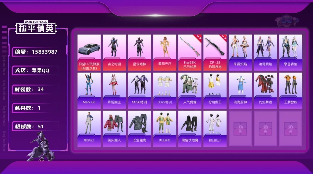 [15833987]苹果 手Q-3粉装-2特效枪-1载具-0粉色飞行器-16272热力值-3王牌印记-34套装-51枪皮【热门品类】:角色-Mark.06【粉色套装】:角色-宙之时溯,角色-星云暗核,角色-羲和光序【粉色枪皮等级】:Kar98K-巳巳如意(五级),DP-28-豹影疾电(三级)【粉色载具】:仰望U7(阿盖尔紫)【粉色枪皮】:Kar98K-巳巳如意,DP-28-豹影疾电