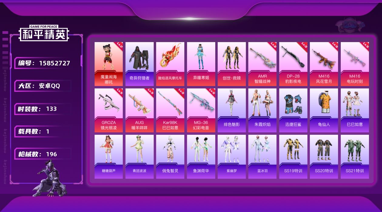 [15852727]【特价出售/店主推荐】安卓 手Q-1神装-2粉装-8特效枪-1载具-2粉色飞行器-53876热力值-6王牌印记-133套装-196枪皮 【红色神装等级】:魔童闹海-哪吒(二级) 【红色角色神装】:魔童闹海-哪吒 【热门品类】:套装-奇异狩猎者,套装-龟仙人 【粉色套装】:套装-创世·救赎,角色-异瞳寒姬 【粉色枪皮等级】:M416-风花雪月(五级),M416-电玩时刻(五级),GROZA-镜光银凌(五级),AUG-暖羊咩咩(五级),Kar98K-巳巳如意(五级),AMR-智耀战神(六级),DP-28-豹影疾电(五级),MG-36-幻彩电音(五级) 【粉色载具】:踏焰逐风摩托车 【粉色枪皮】:M416-风花雪月,M416-电玩时刻,GROZA-镜光银凌,AUG-暖羊咩咩,Kar98K-巳巳如意,AMR-智耀战神,DP-28-豹影疾电,MG-36-幻彩电音 【粉色飞行器】:飞天猪飞行器 【粉色降落伞】:至尊龙雀降落伞,环太平洋降落伞,江南烟雨降落伞,创世·救赎降落伞,忍者神龟降落伞,临安公主降落伞,星穹咏叹调降落伞,魔童闹海 哪吒降落伞,异瞳寒姬降落伞,炫彩糖果降落伞 【稀有套装】:套装-龟仙人,套装-巳巳如意,套装-糖糖葫芦,套装-青团波波,角色-俏兔智灵,套装-鱼渊荷华,套装-紫幽梦,套装-蓝冰羽,套装-朱霞炽焰,角色-绯色魅影,套装-炫彩糖果 【稀有枪皮】:AUG-冰晶雪宝,AKM-彩虹符号,AKM-破晓战魂,AKM-缤纷海域,AKM-龙的传人,M16A4-幻世战舞者,M16A4-甜心亚梦,M16A4-红色方程式,M16A4-蓝色火焰,SCAR-L-玉兔迎春,SCAR-L-红色方程式,M416-糯团青竹,M416-红色方程式,M416-绯红前夜,M416-蓝色火焰,GROZA-彩虹符号,GROZA-懵萌河马,AUG-天降萌叽,AUG-耀粉歌者,QBZ-彩虹符号,M762-天降萌叽,M762-奇异狩猎者,M762-彩虹符号,M762-绯红前夜,Mk47-妙红点点,Mk47-炫光之旅,G36C-懵萌河马,G36C-星穹咏叹调,AC-VAL-天降萌叽,AC-VAL-甜心亚梦,AC-VAL-闲梦青缨,蜜獾-天降萌叽,蜜獾-娇憨猪猪,ARX-凌霄紫焰,UZI-啾咪啾咪,UZI-天降萌叽,UZI-娇憨猪猪,UZI-红色方程式,UZI-月影灵韵,UMP45-仲夏莫吉托,UMP